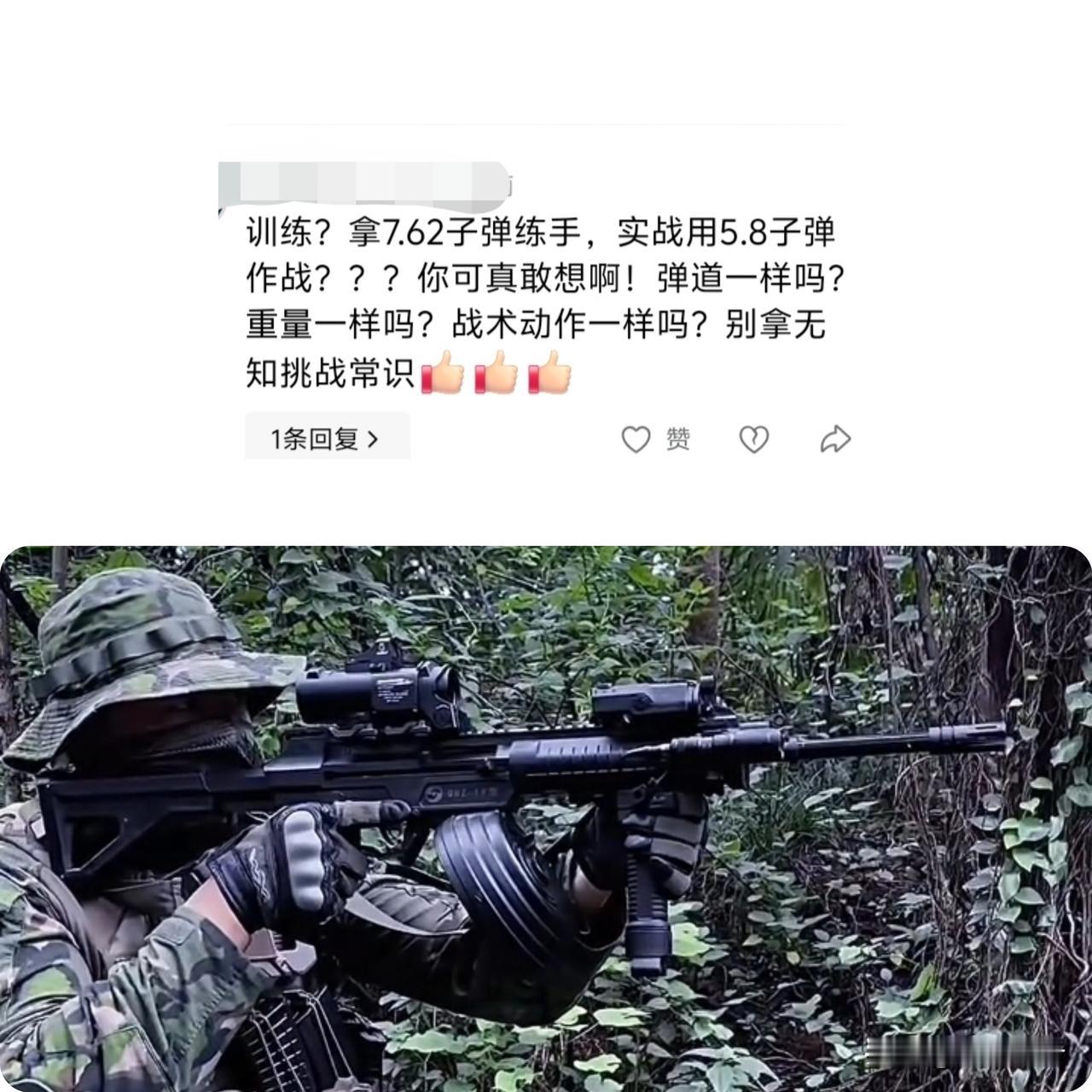 昨日关于191型步枪7.62毫米版本的文章评论区里一条评论让我很震惊--我们国家只是禁枪,又不是禁网或者禁止学习讨论相关枪械知识,这怎么想出来的?声明:截图放在这里不是嘲笑!就事论事,反正都是科普类话题,就以他提出来的弹道、重量与战术三个方面为主题展开聊聊。