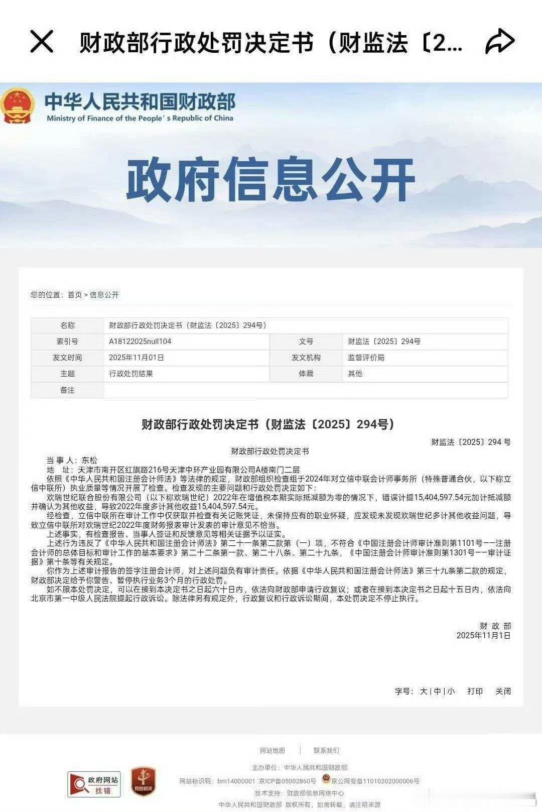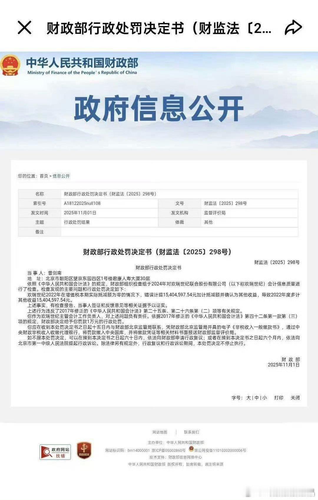 欢瑞世纪因违法违规被证监会立案财政部行政处罚决定书:欢瑞世纪联合股份限公司(以下称欢瑞世纪)2022年在增值税本期实际抵减额为零的情况下,错误计提15,404,597.54元加计抵减额并确认为其他收益,导致2022年度多计其他收益15,404,597.54元。
