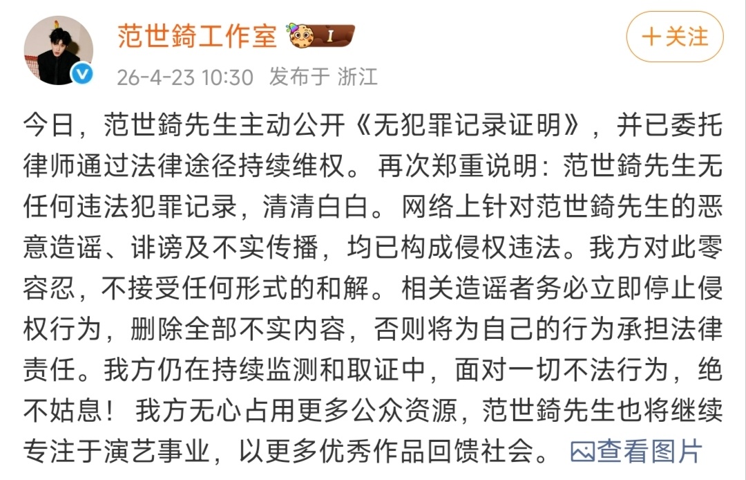 范世錡公开无犯罪记录证明并启动名誉维权“范世绮先生无任何违法犯罪记录,清清白白。