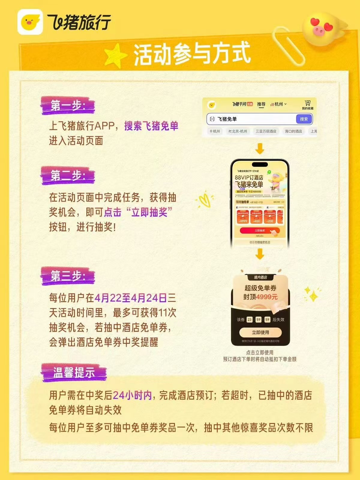 五一订酒店有点肉疼?刷到飞猪这个免单活动,赶紧来喊你试试。4月22日到24日,上飞猪搜“飞猪免单”就能玩。
