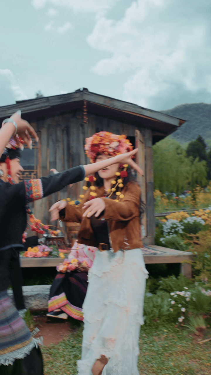 马思纯云南体验簪花 马思纯把簪花戴出了新的味道,不是刻意的是很自然的融合。她笑着