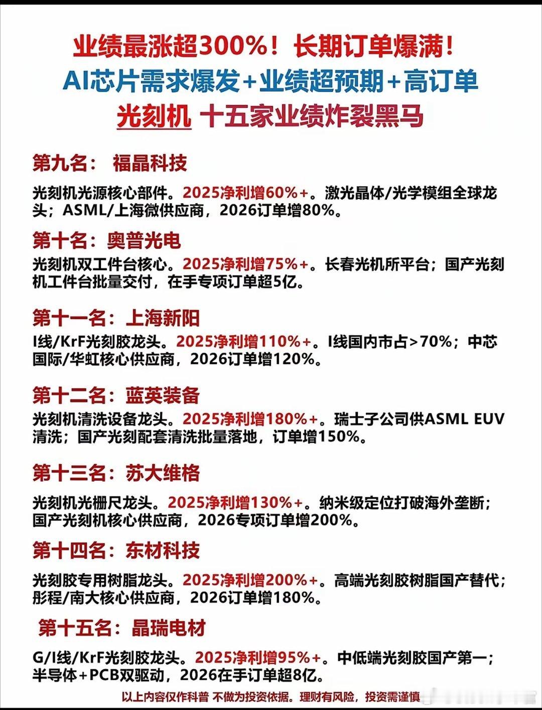 光刻机概念业绩炸裂黑马盘点! AI芯片需求爆发带动国产光刻设备与材料加速突破,15家业绩黑马净利最高暴涨超300%,从光刻胶到光学元件,从核心部件到配套设备,国产替代订单排满,业绩超预期兑现,成为半导体自主可控赛道最具爆发力的成长主线。财经观察官 主页有群,欢迎大家一起抱团取暖