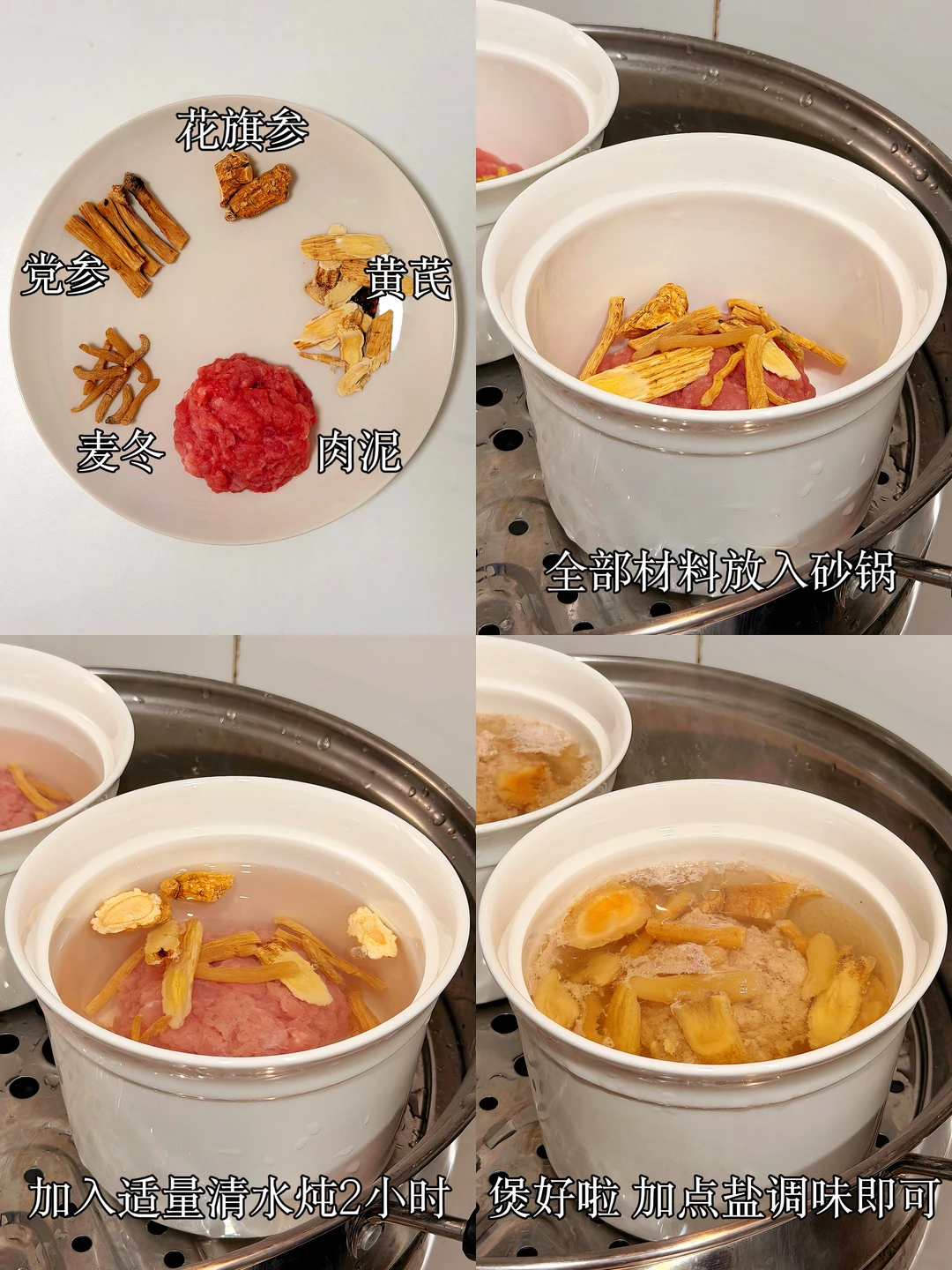 🍲食材:花旗参(10g)、党参(15g)、黄芪(10g)、麦冬(10g)、猪瘦肉(300g)
