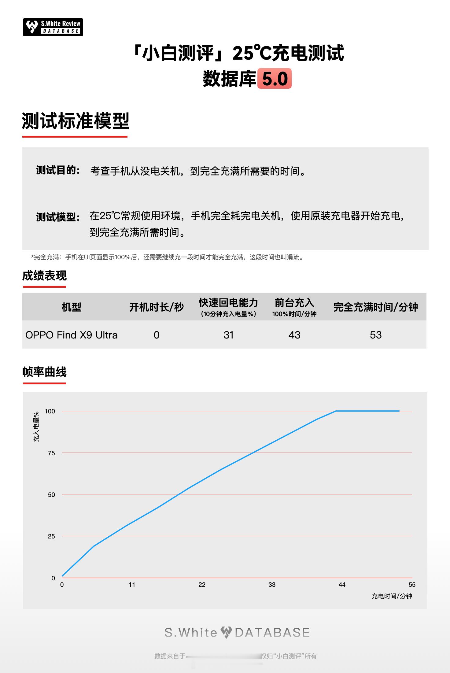 「充电表现」25℃标准环境温原装充电器测试:10分钟快速回电31%,43分钟前台充入100%,53分钟完全充满。