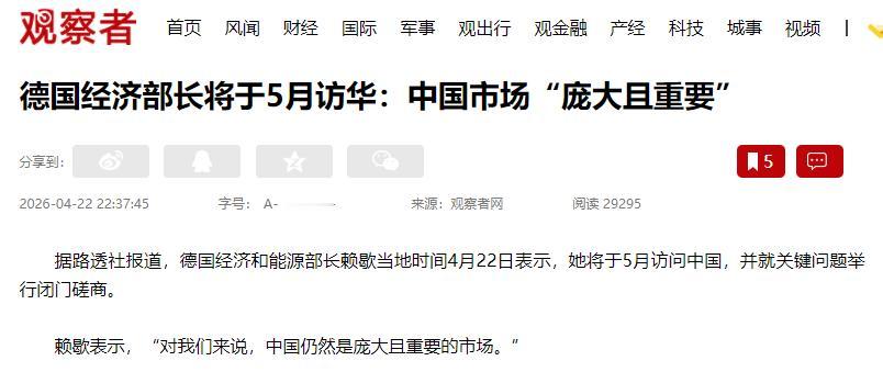 当地时间4月22号,德国经济和能源部长赖歇,明确说了要在5月份来中国访问,到时候会和中方关起门来,商量经贸上的关键事儿。