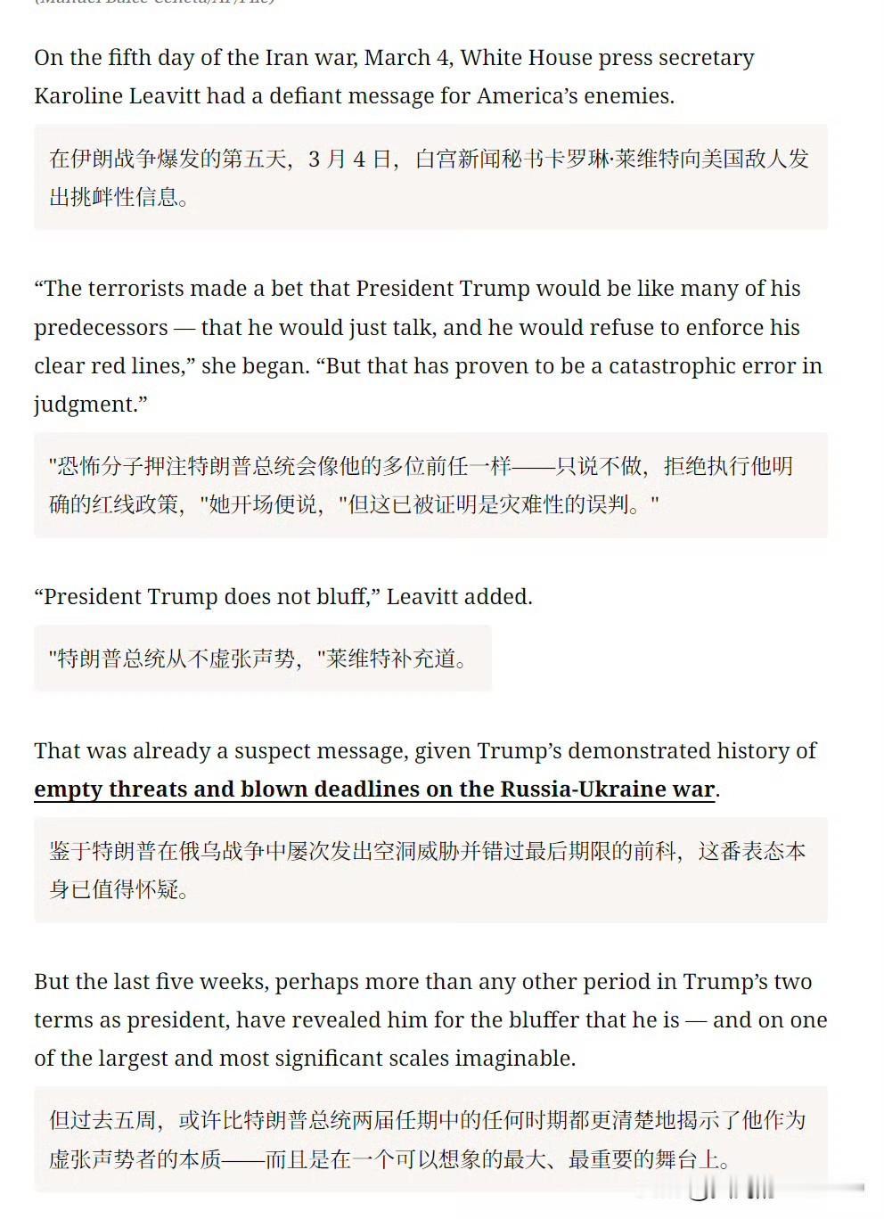 在伊朗战争爆发的第五天,3 月 4 日,白宫新闻秘书卡罗琳·莱维特向美国敌人发出挑衅性信息,“特朗普总统从不虚张声势。”
