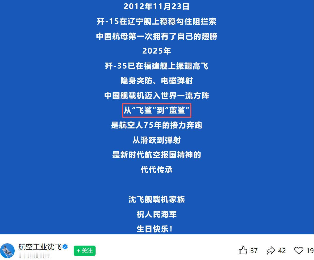 虽然早在多年之前,就有多方消息表示歼-35舰载战斗机的绰号叫“蓝鲨”,与歼-15战机的“飞鲨”对应。但此次沈飞放出的消息,应该还是官方首次公开承认歼-35的“蓝鲨”绰号,这下就毫无争议了。