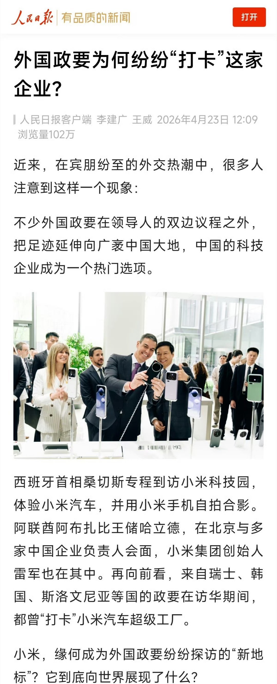 人民日报评外国政要打卡小米