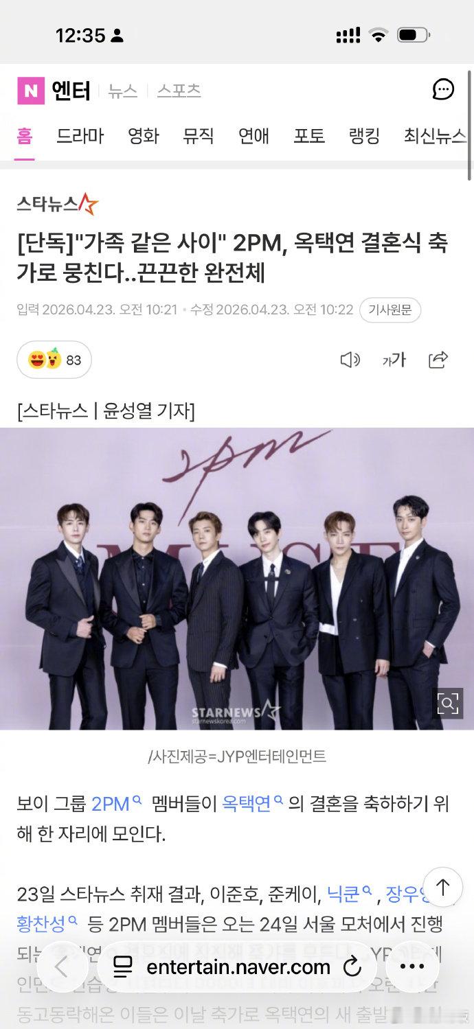 2PM将完整体参加玉泽演婚礼 4月23日根据Star News的采访结果,李俊昊、Jun-K、Nichkhun、张祐荣、黄灿盛等2PM成员将出席24日在首尔某地举行的玉泽演的婚礼,并演唱祝歌。从JYP Entertainment练习生时期到2008年出道以后,长时间同甘共苦的他们,当天将以祝歌的形式为玉泽演的新出发加油助威。据悉,玉泽演在2013年电影《结婚前夜》上映之前进行的杂志采访中,将2PM成员选为希望为婚礼唱祝歌的歌手。另外,玉泽演去年11月亲自宣布与非艺人恋人结婚。 他通过亲笔信传达了消息,称"我承诺与长时间理解我、信任我的人共度一生","我会成为彼此坚实的存在,共同维持今后的生活" 婚礼将以非公开的形式举行,只有两家人和亲朋好友参加。