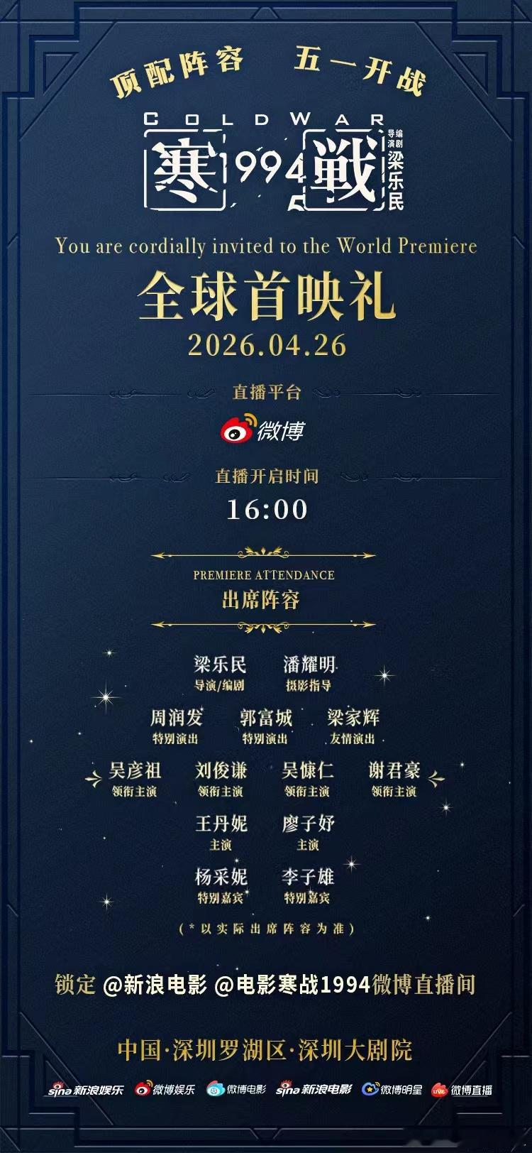 电影寒战1994全球首映礼 将于4月26日开启!周润发、梁家辉、郭富城、吴彦祖、刘俊谦、吴慷仁、谢君豪、王丹妮、廖子妤等主创齐聚,当日16点蹲守下方直播间,共同见证“寒战宇宙”序章揭晓吧🧊现特别发起寒战1994首映礼整活部门招聘,诚邀各位“策划官”前往寒战,带话题分享你为某位主创特别设计的红毯互动,被“锁定”的创意点子,将由TA现场“接单”哦~