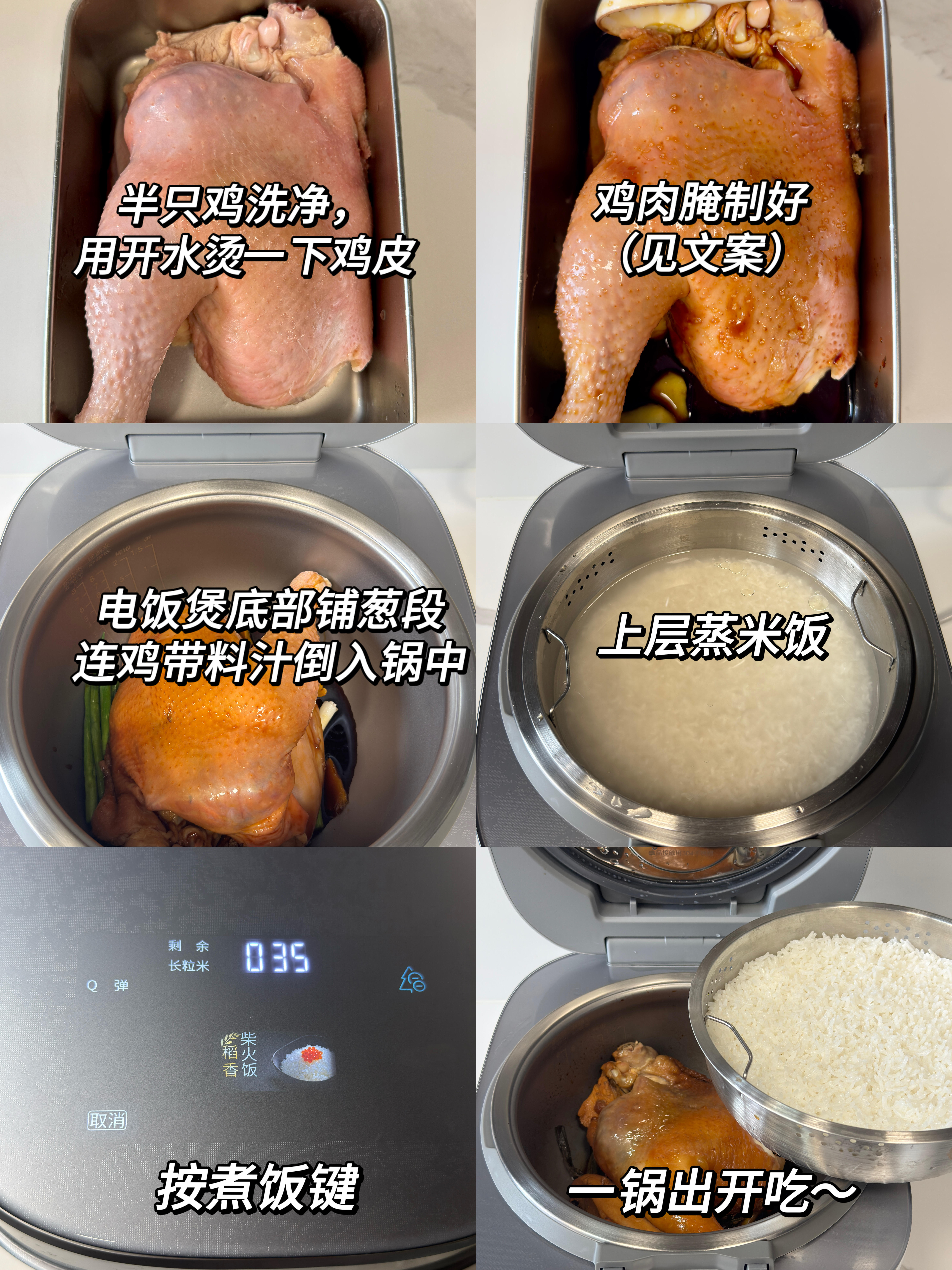 2️⃣ 准备工作做好后,电饭煲底部铺上葱段,把腌制好的鸡连同腌制的料汁一起倒入电饭煲中,不用额外加水,料汁的量刚好能浸润鸡肉。