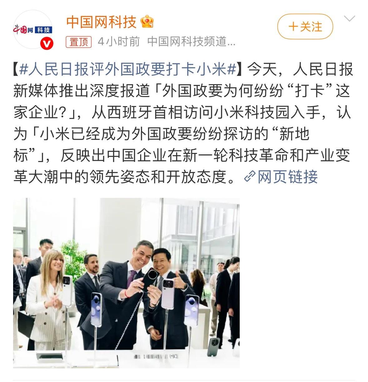 不知道大家刷没刷到,人民日报的深度报道,大概内容就是外国政要为何纷纷“打卡”小米。前两天西班牙首相专程去小米科技园,坐进YU7里体验车机互联,拿小米手机自拍,连连叫好。
