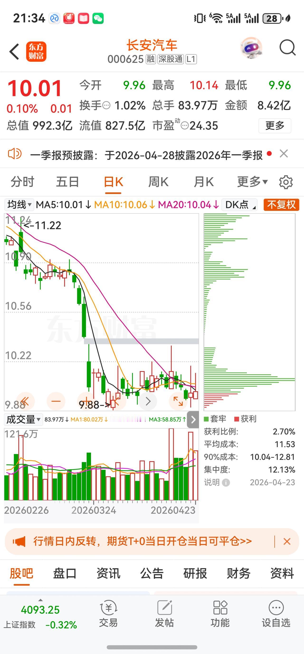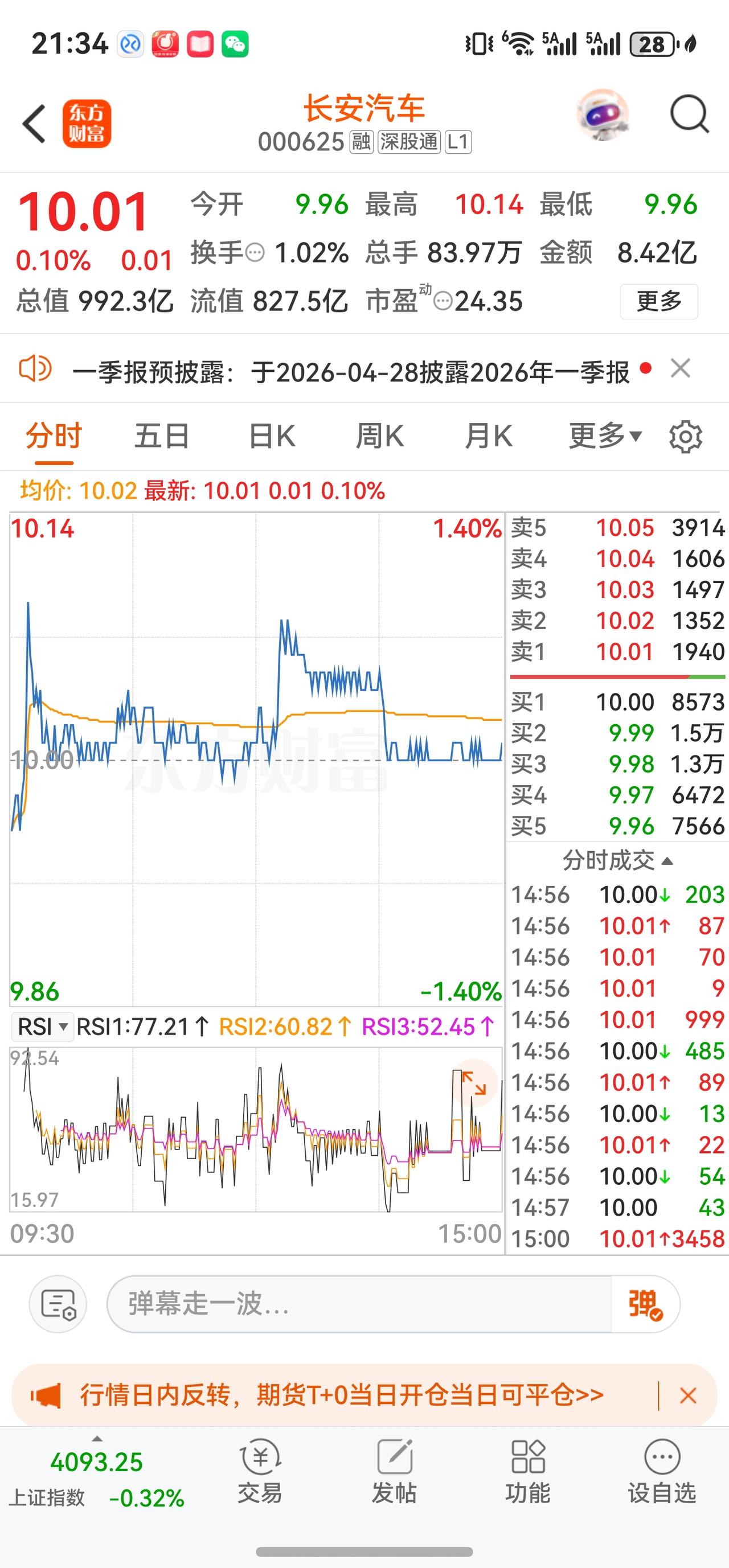 全天走势回顾: 长安汽车今日以9.96元(昨日收盘10.00元)开盘,盘中最高触及10.14元,最低探至9.96元,全天基本围绕10.00元一线窄幅震荡,最终收于10.01元,微涨0.10%。成交量维持在8.42亿元的平平水平,量比仅0.96,低于1,说明今日成交热度不及同期平均水平。委比高达66.19%,买盘挂单规模远超卖盘,反映下方承接意愿温和,但主动买盘的实际推动力有限。