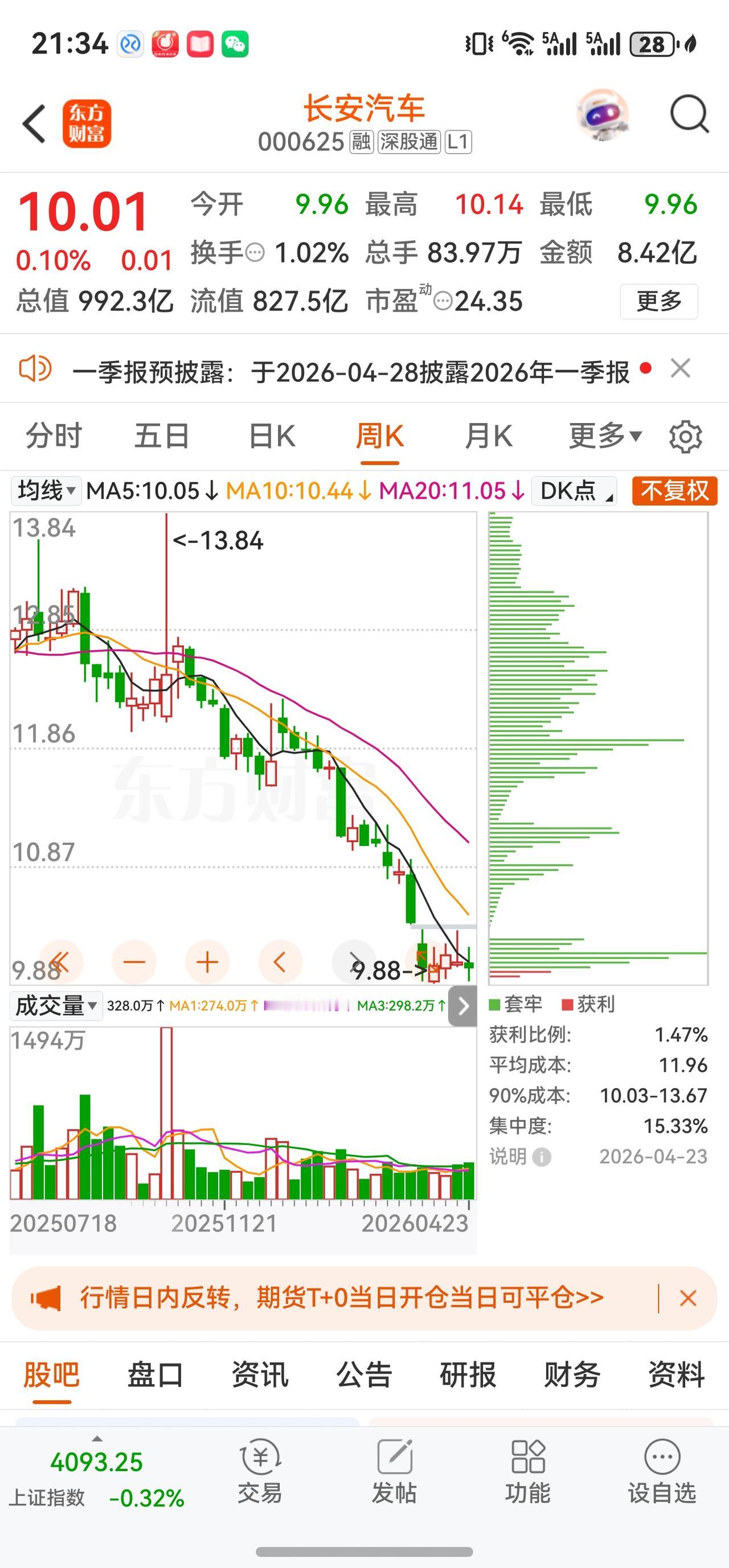 从4月17日的10.06元到今日10.01元,连续多个交易日量能持续萎缩,量比始终在1以下运行,五日涨跌幅及权重排名均处于板块后半段。缩量阴跌通常是"下跌初期但抛压尚未全部释放完毕"的信号。目前股价距离52周低点9.88元仅差0.13元,已回吐了进入2026年以来几乎全部累积涨幅。