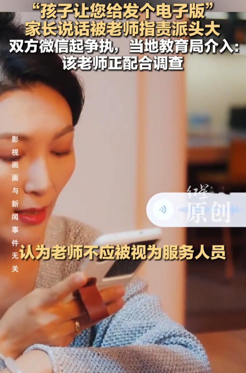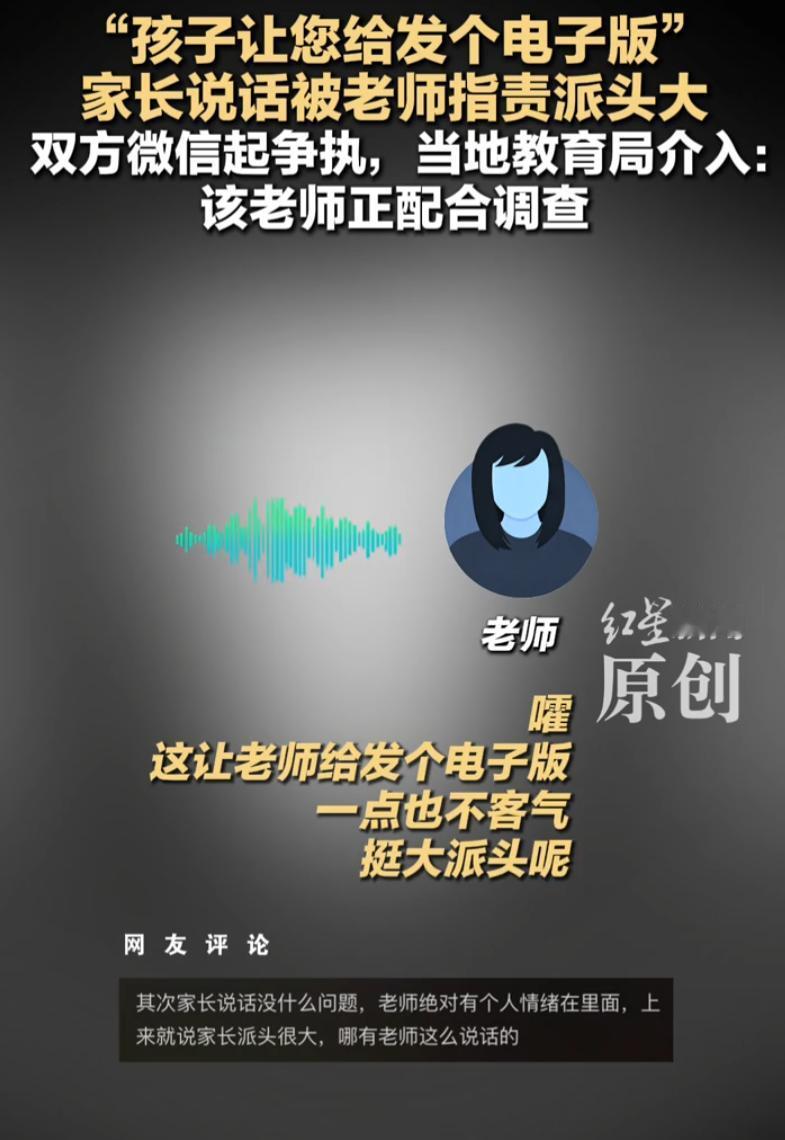 重点是那句“想让您给发个电子版”。这句话里面,没有称呼,没有客套,没有“不好意思打扰了”,也没有“方便的话”。在家长看来,这就是一句很直白的话,有什么问题?我又没骂人,又没催,就是正常说话啊