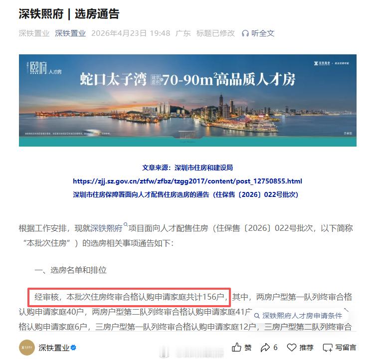 也是深圳最贵人才房了,最终通过报名人数156户,后天开始选房。深圳