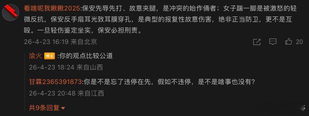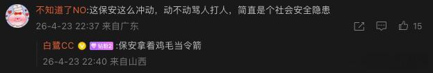 网上也各种群魔乱舞,说保安无权管司机乱停的事情!说保安欺软怕硬,如果是遇到大汉,他就不敢打!说这个保安是社会的安全隐患!应该刑责坐牢!应该严查他是不是第一次打人!大家都要求严惩保安,杀鸡儆猴。