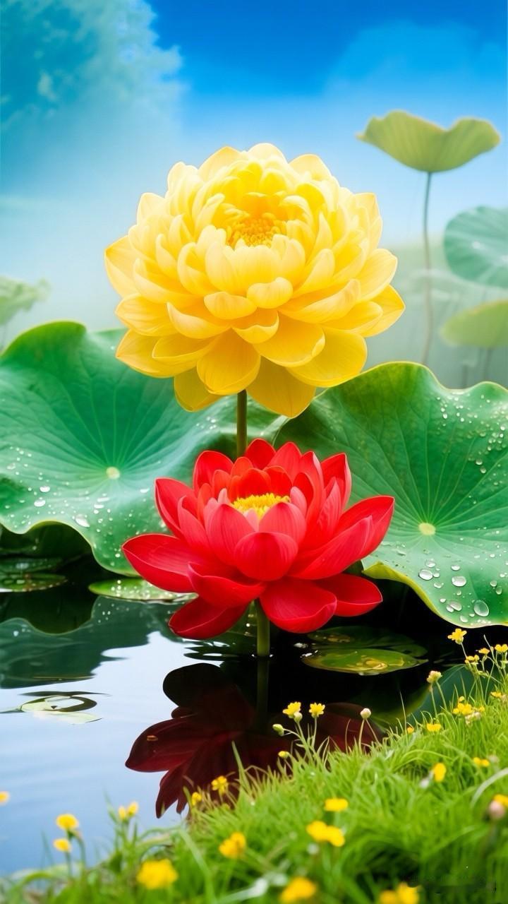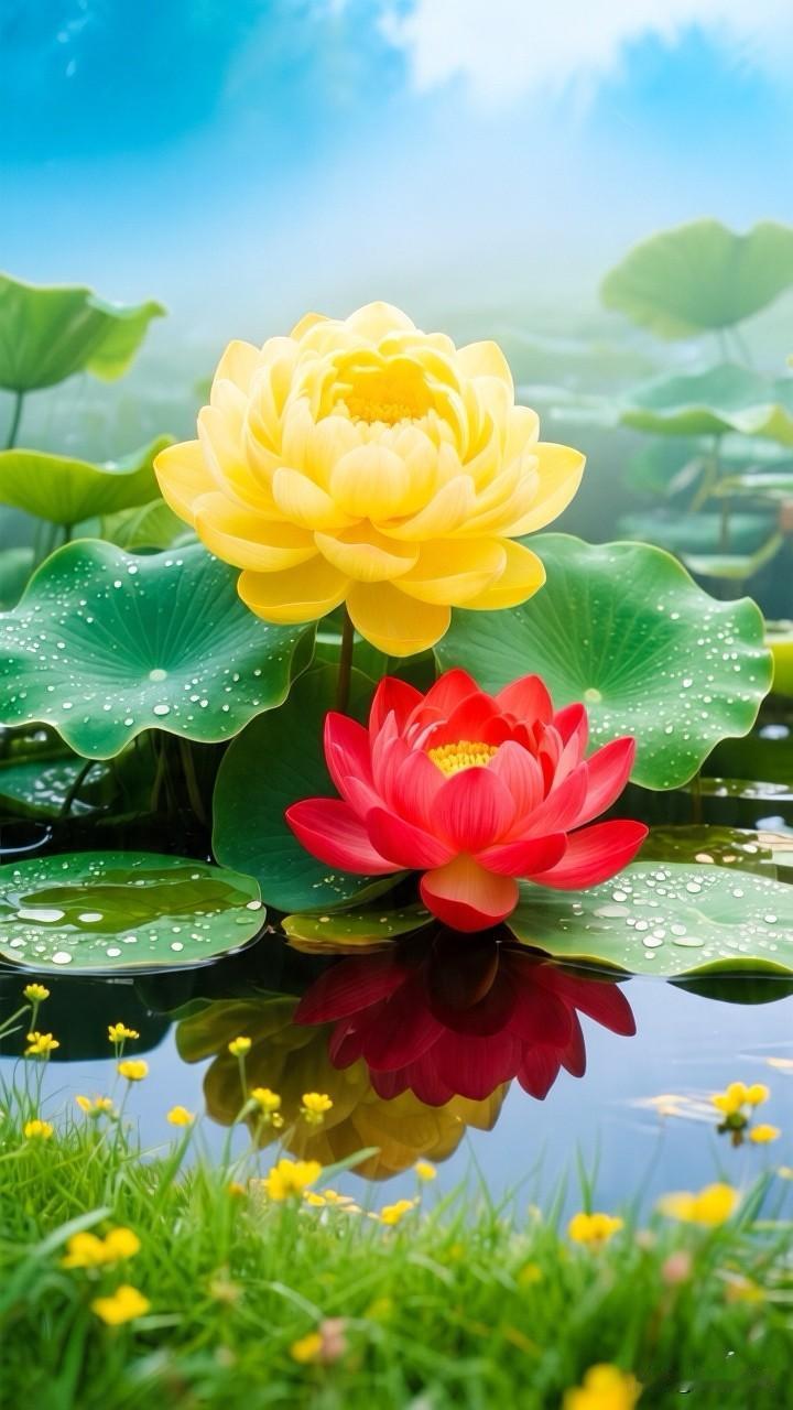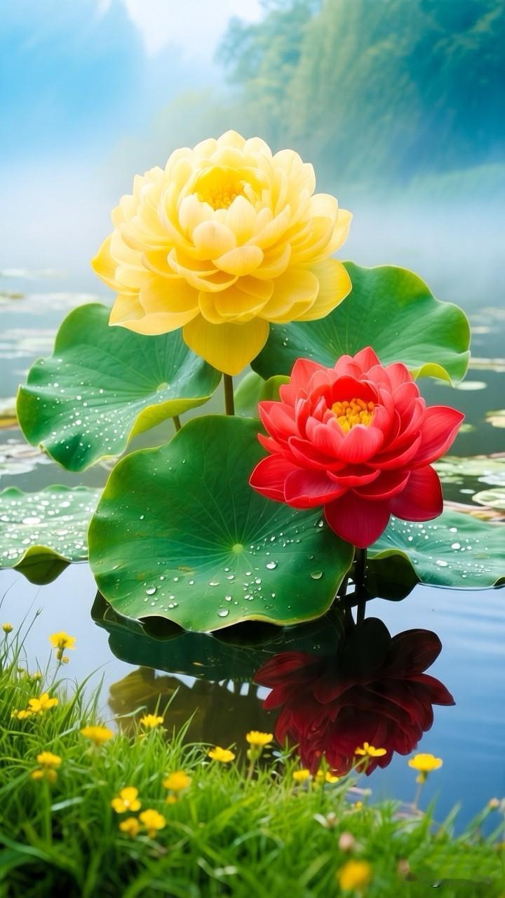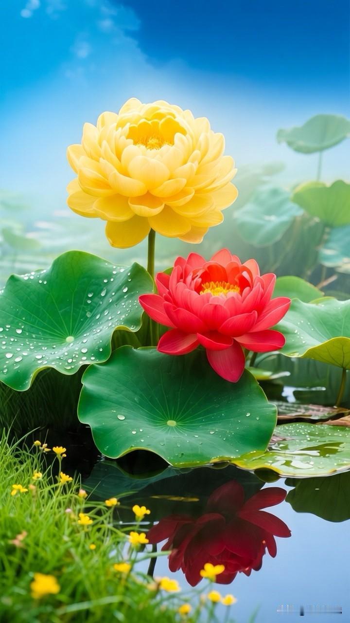 一池斑斓,半亩方塘,黄的灿烂,红的热烈,在这池碧水间,黄荷明媚如骄阳,红荷热烈似火焰,同根并蒂,共映清波……[祈祷]
