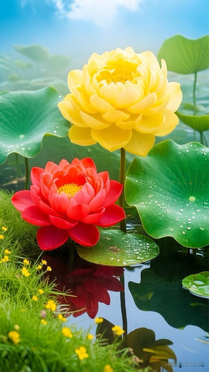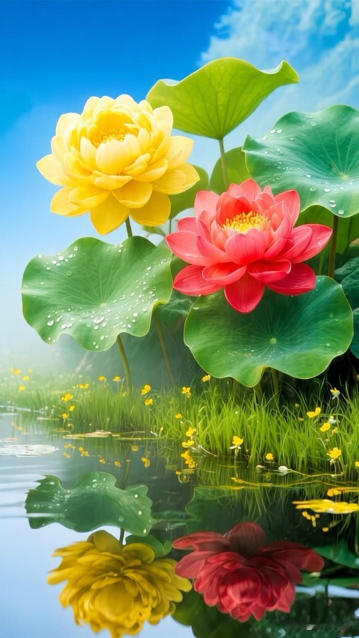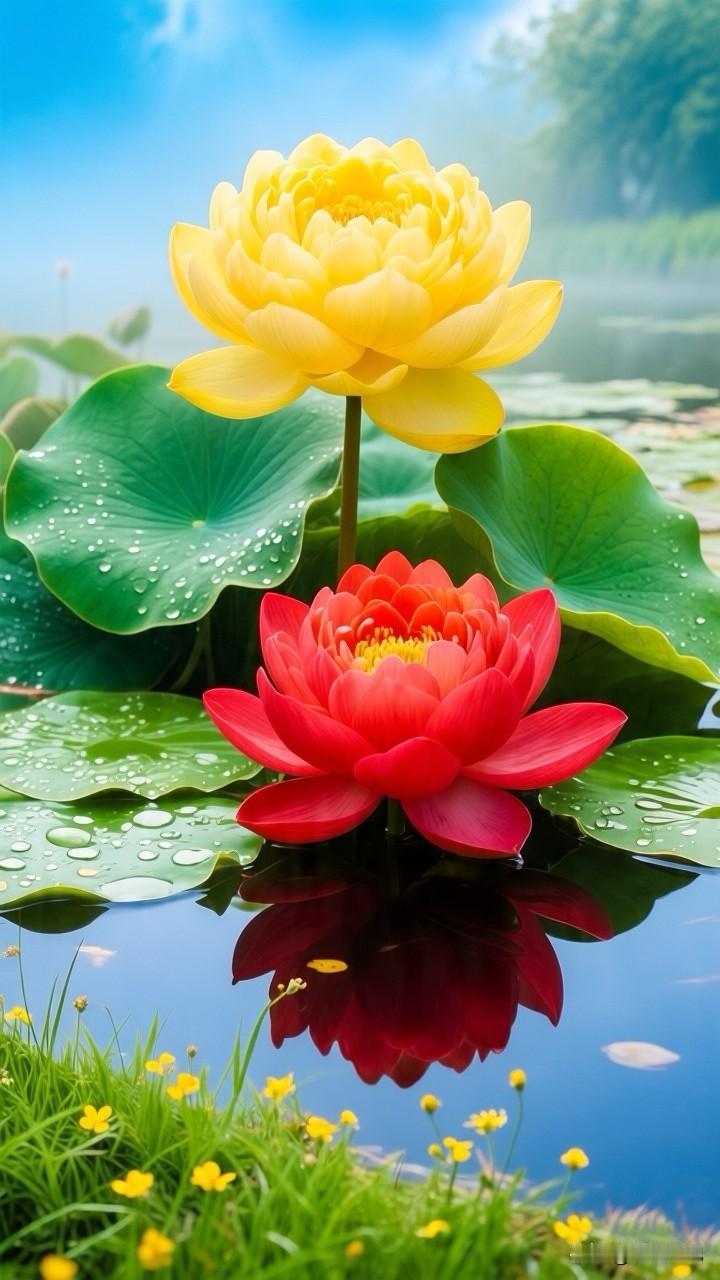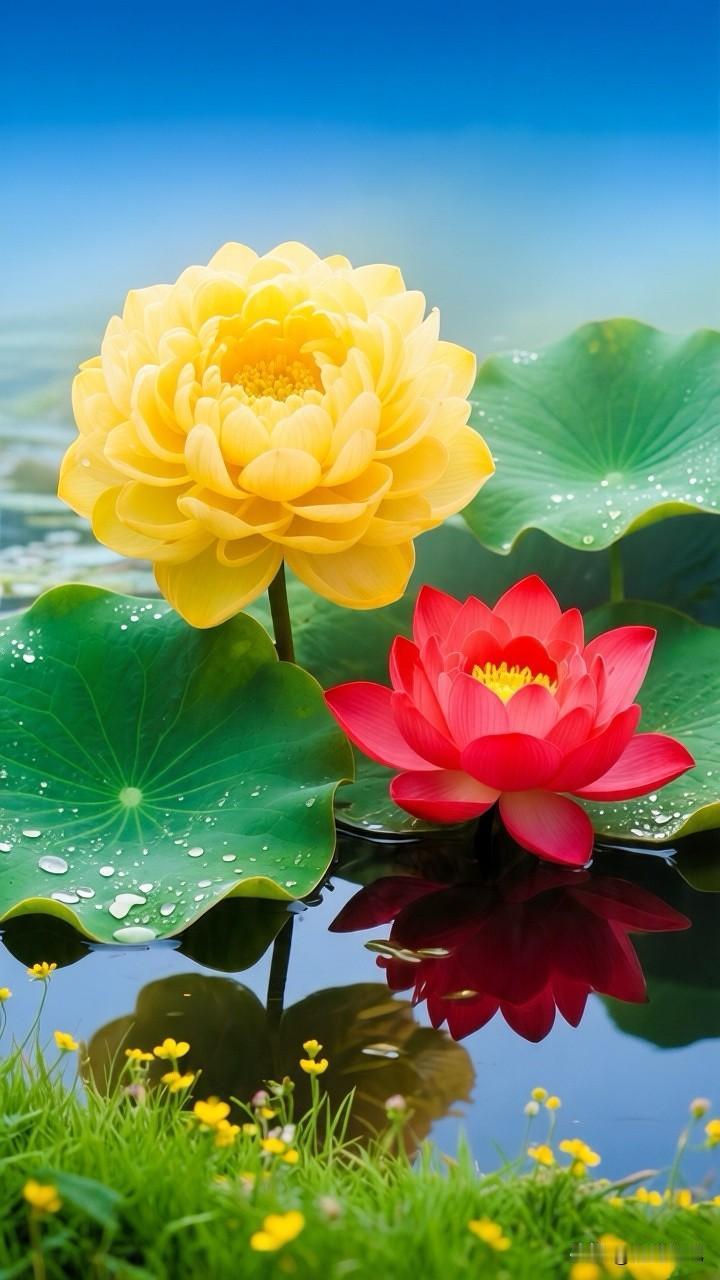 一池斑斓,半亩方塘,黄的灿烂,红的热烈,在这池碧水间,黄荷明媚如骄阳,红荷热烈似火焰,同根并蒂,共映清波……[祈祷]