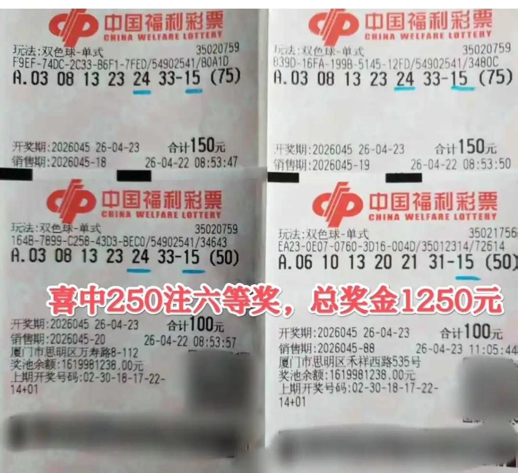 双色球26045期开奖,当期头奖开出12注,单注奖金621万元。福建一位彩民出手500元,采用高倍投方式购彩,两张75倍、两张50倍单式票,虽无缘头奖,却精准锁定开奖蓝球15,一举拿下250注六等奖,斩获奖金1250元,小成本收获稳稳福利。