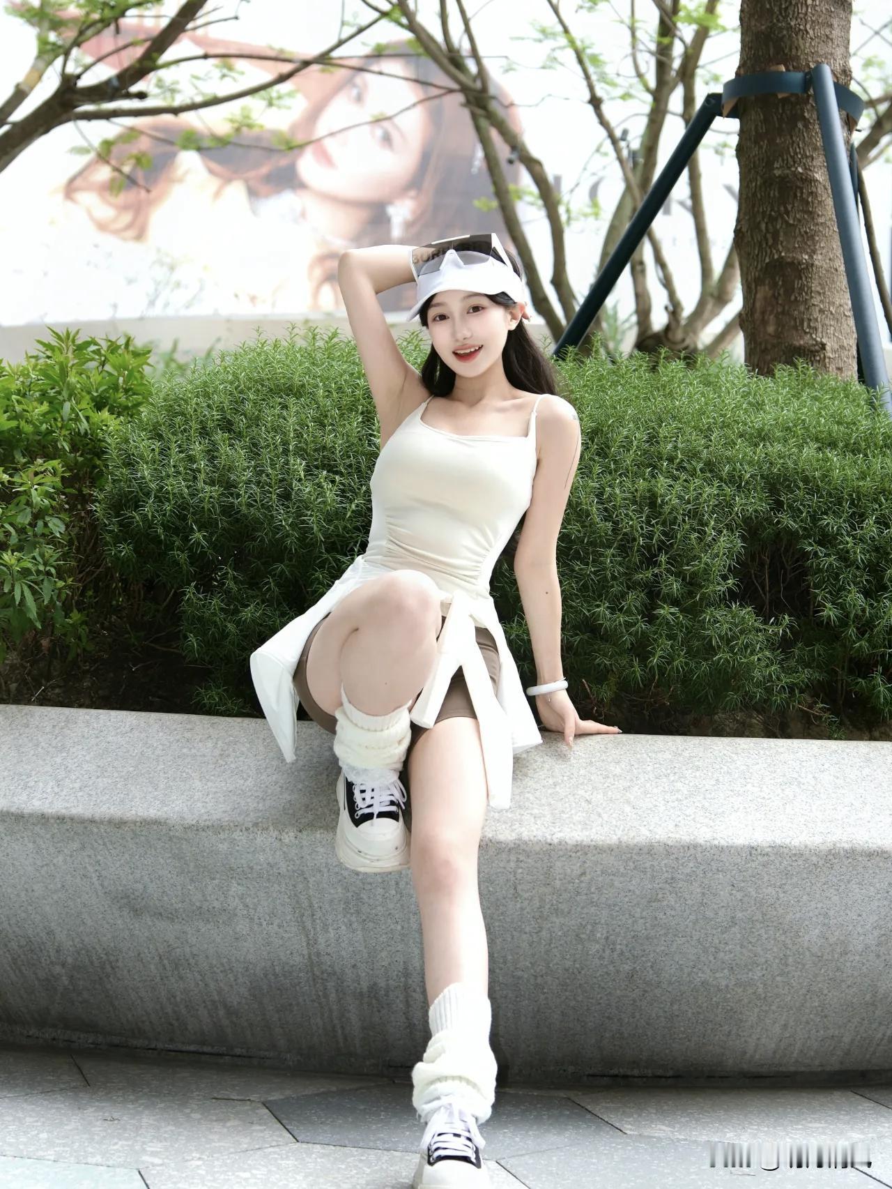 站在花坛前,身体往前倾一点,凑近镜头。双手叉腰,腰上绑件白外套自然垂下来。这个方法真挺管用——一前倾,腿的比例马上拉长了。头上戴顶白色遮阳帽,脚踩黑白厚底鞋,配白色腿套。眼神直视镜头,笑得自然点就行。平视拍全身,整个人显得又高又活泼。