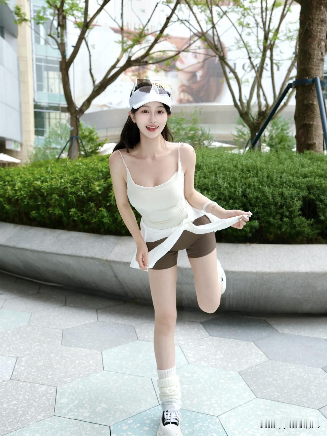 昨天在广场试了这组元气街拍,白色吊带搭咖色短裤,再加双堆堆袜和厚底鞋,阳光一照,整个人特别精神。绿植和商场当背景,干净又不抢眼。分享两个我最喜欢的动作,学起来很快。