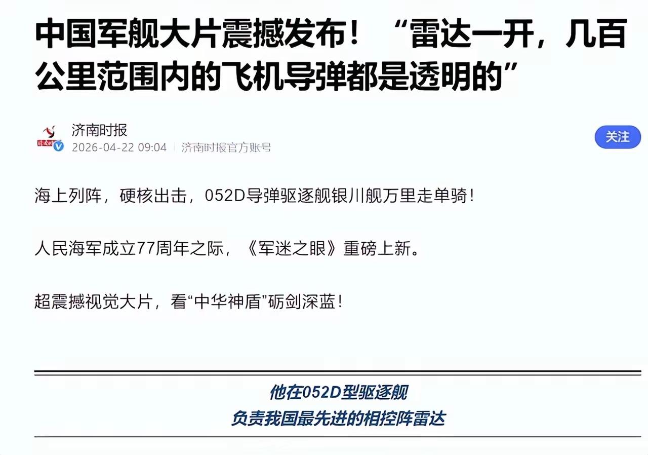 根据央视的报道,052D银川舰的雷达只要一开机,周围几百公里范围内的看得清清楚楚,就连飞机导弹都逃不掉。