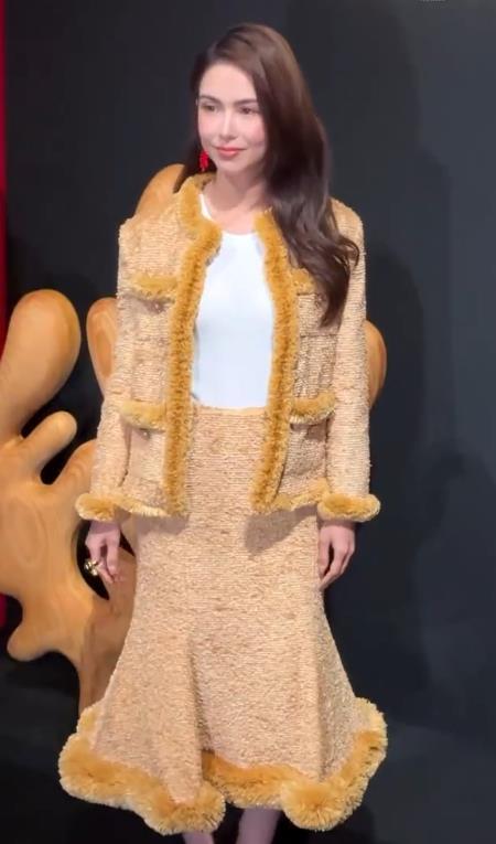 她里面搭配白色背心,外面套着带有毛绒的外套,下身搭配金色的毛绒裙,凸显出了满满的奢华之美。