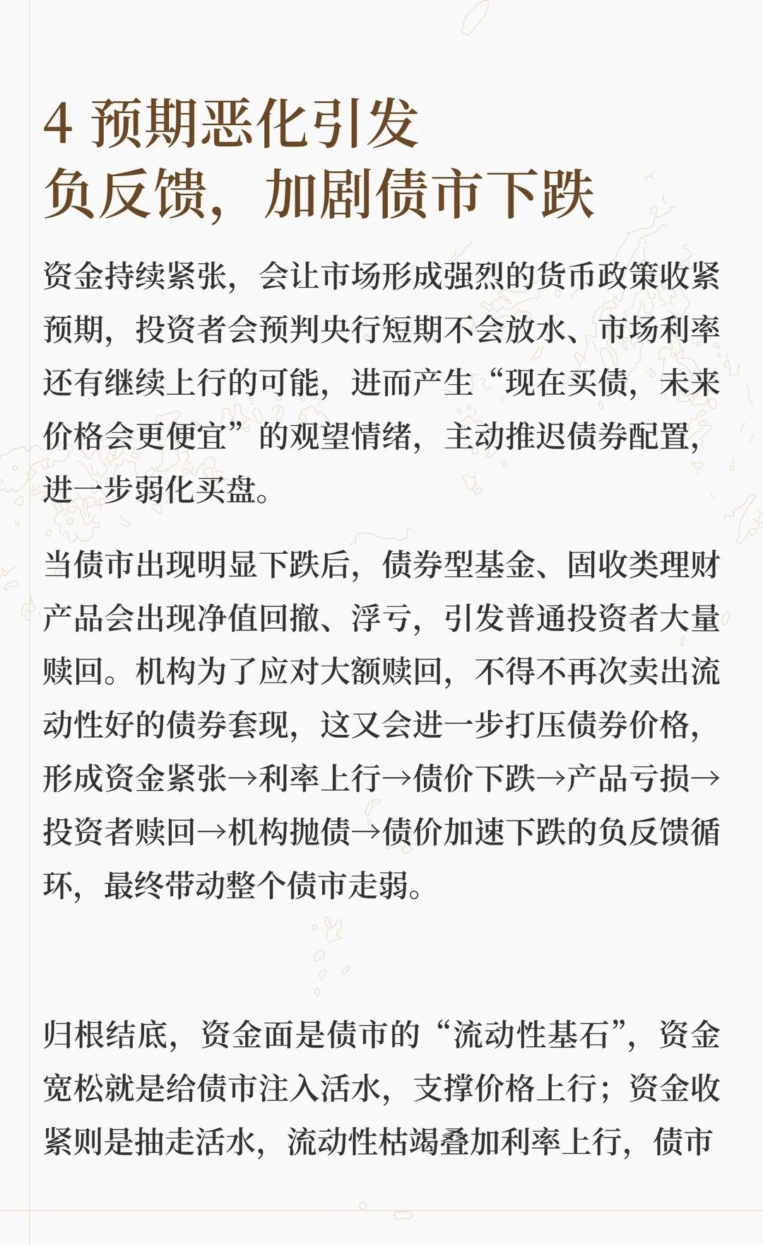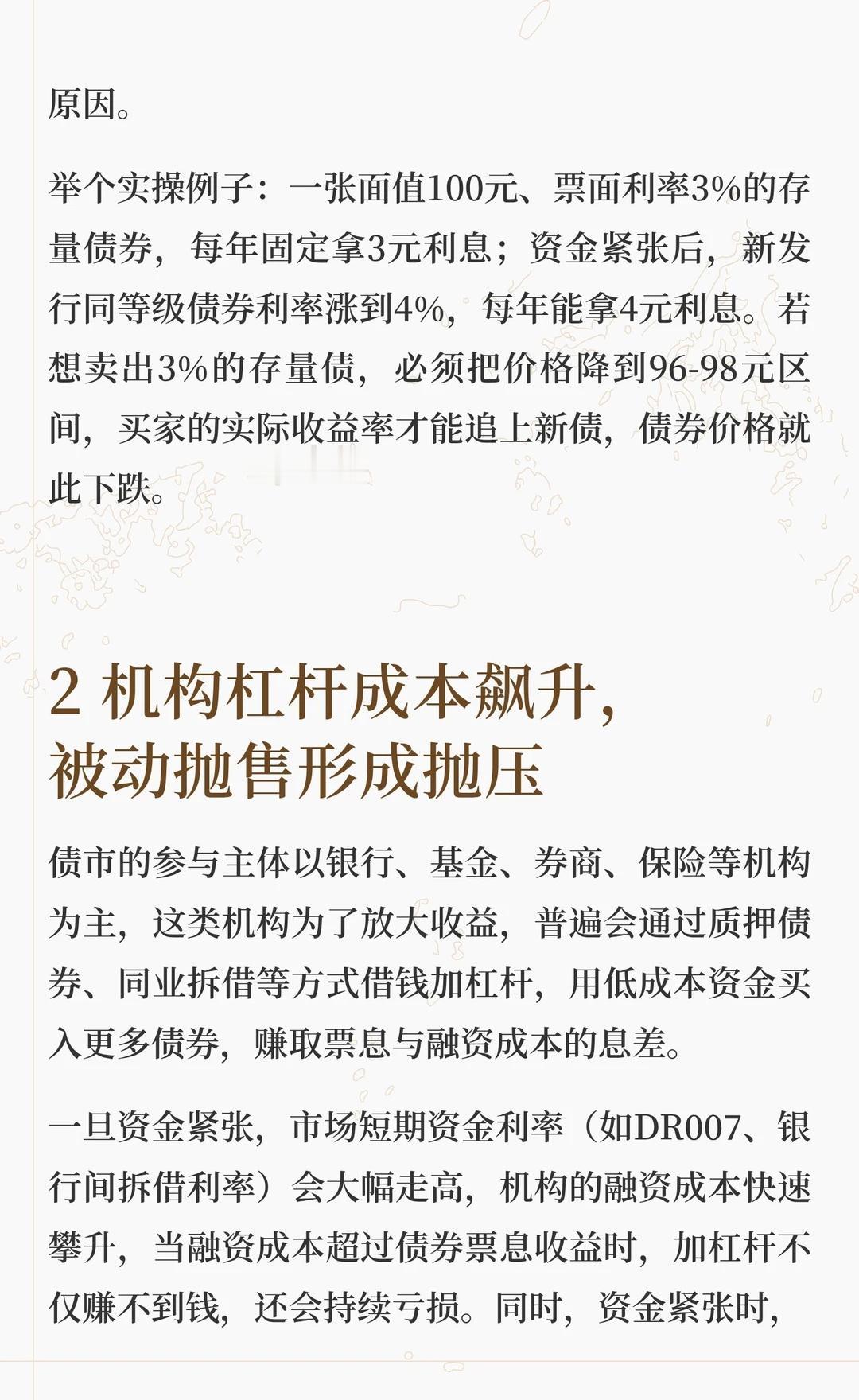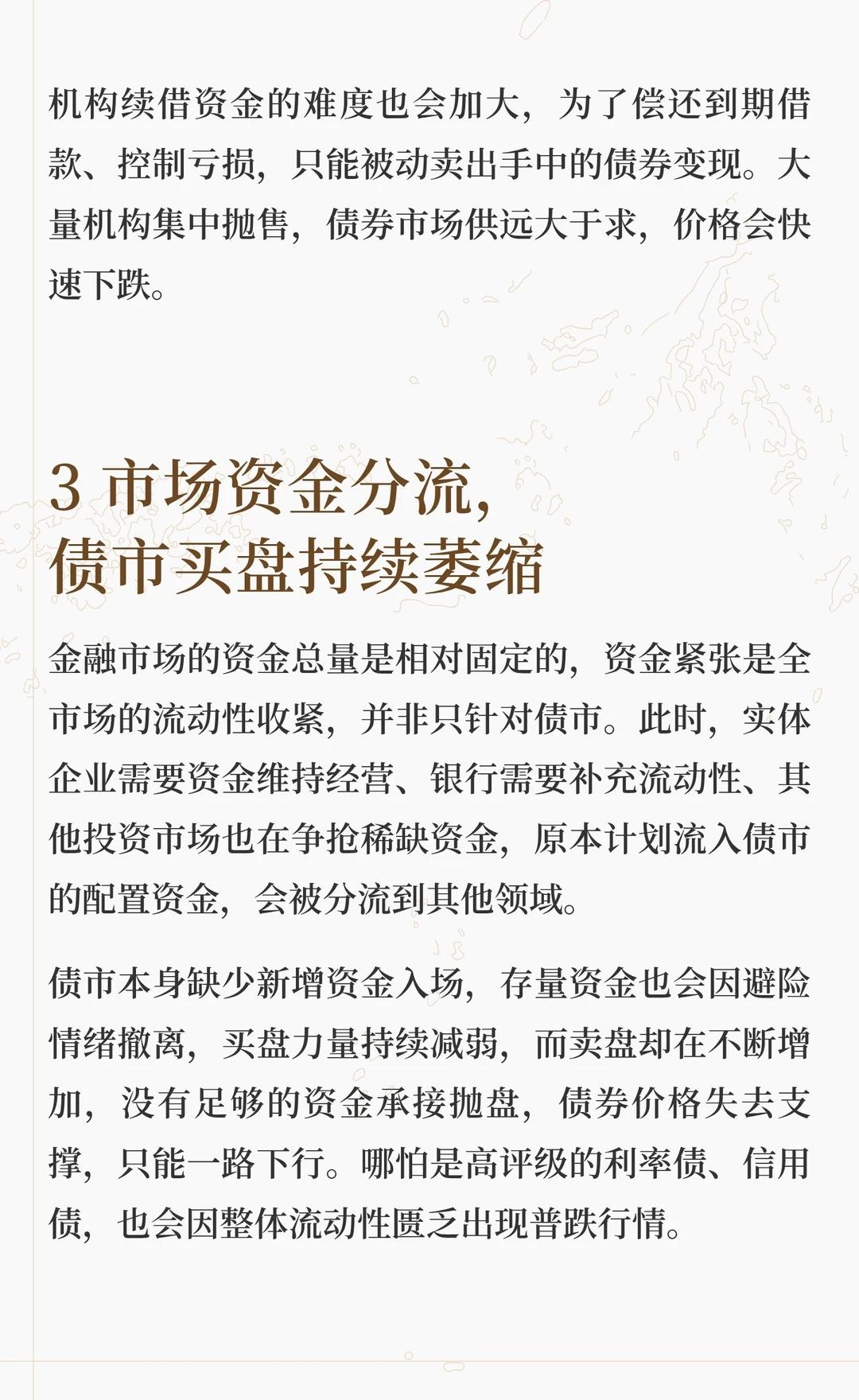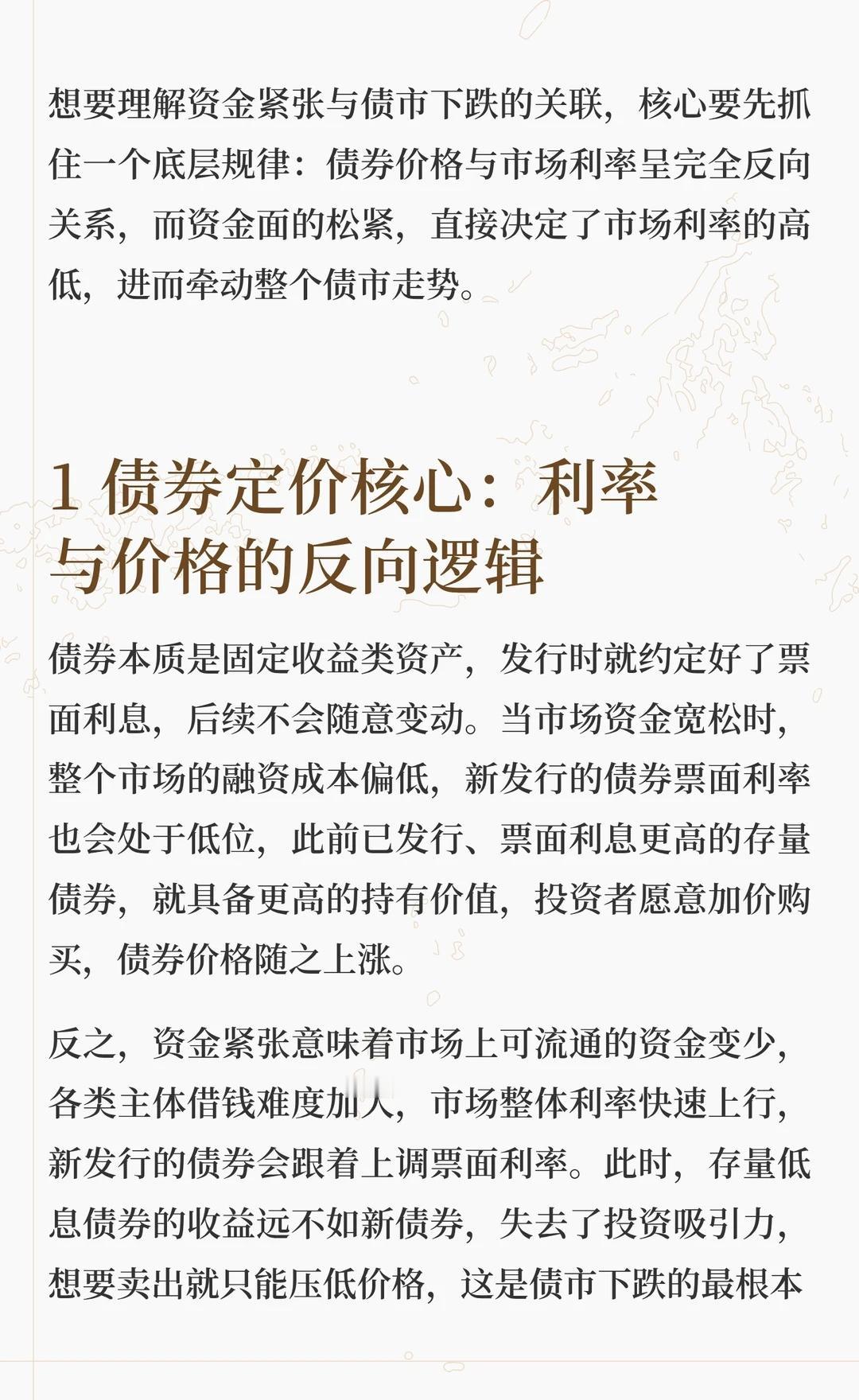 资金紧张导致市场利率上升,债券价格下跌。机构因资金成本上升被迫抛售债券,买盘萎缩,形成负反馈循环,加剧债市下跌。资金面是债市核心,流动性充足时价格上行,紧张时价格下跌。