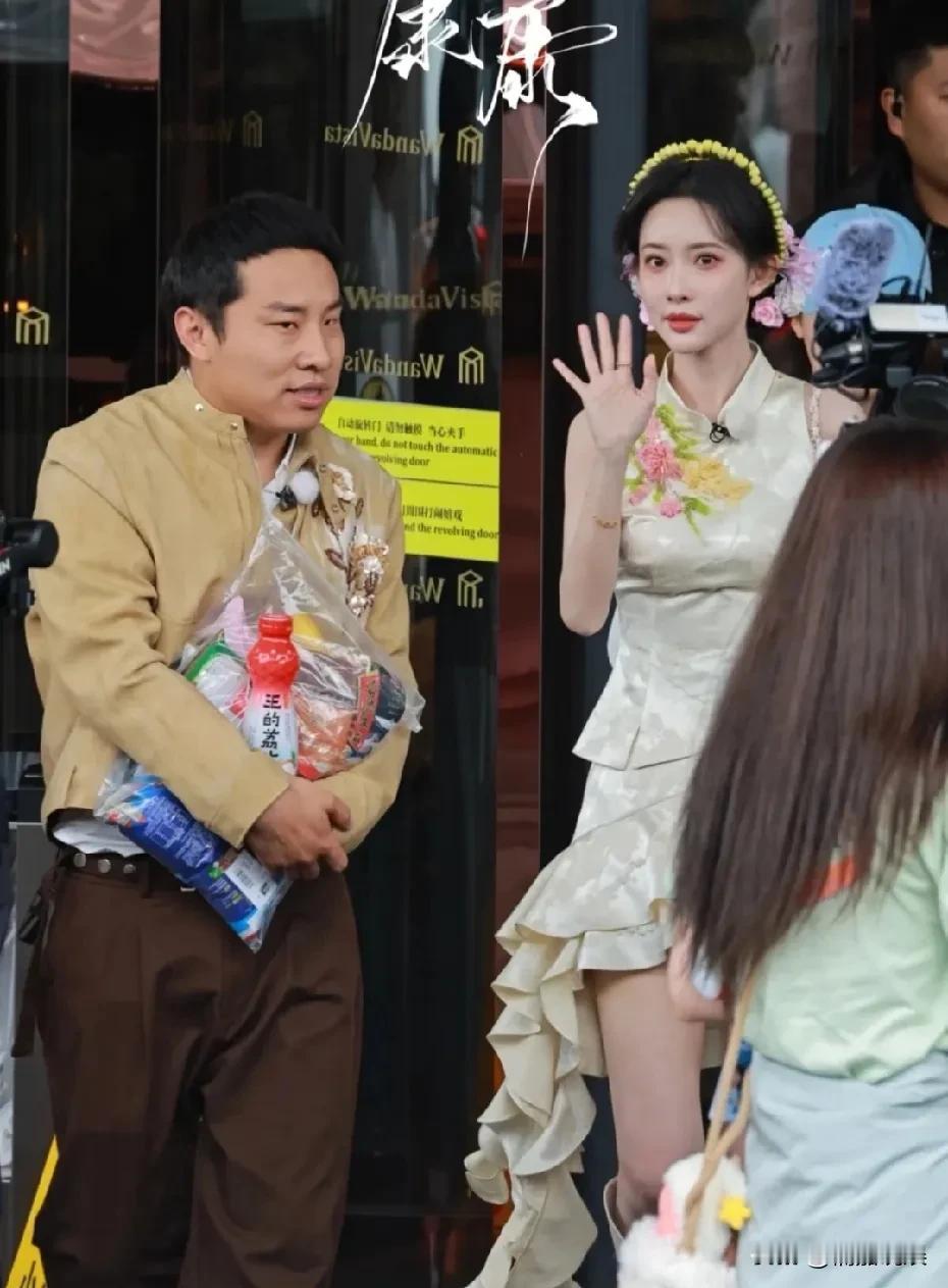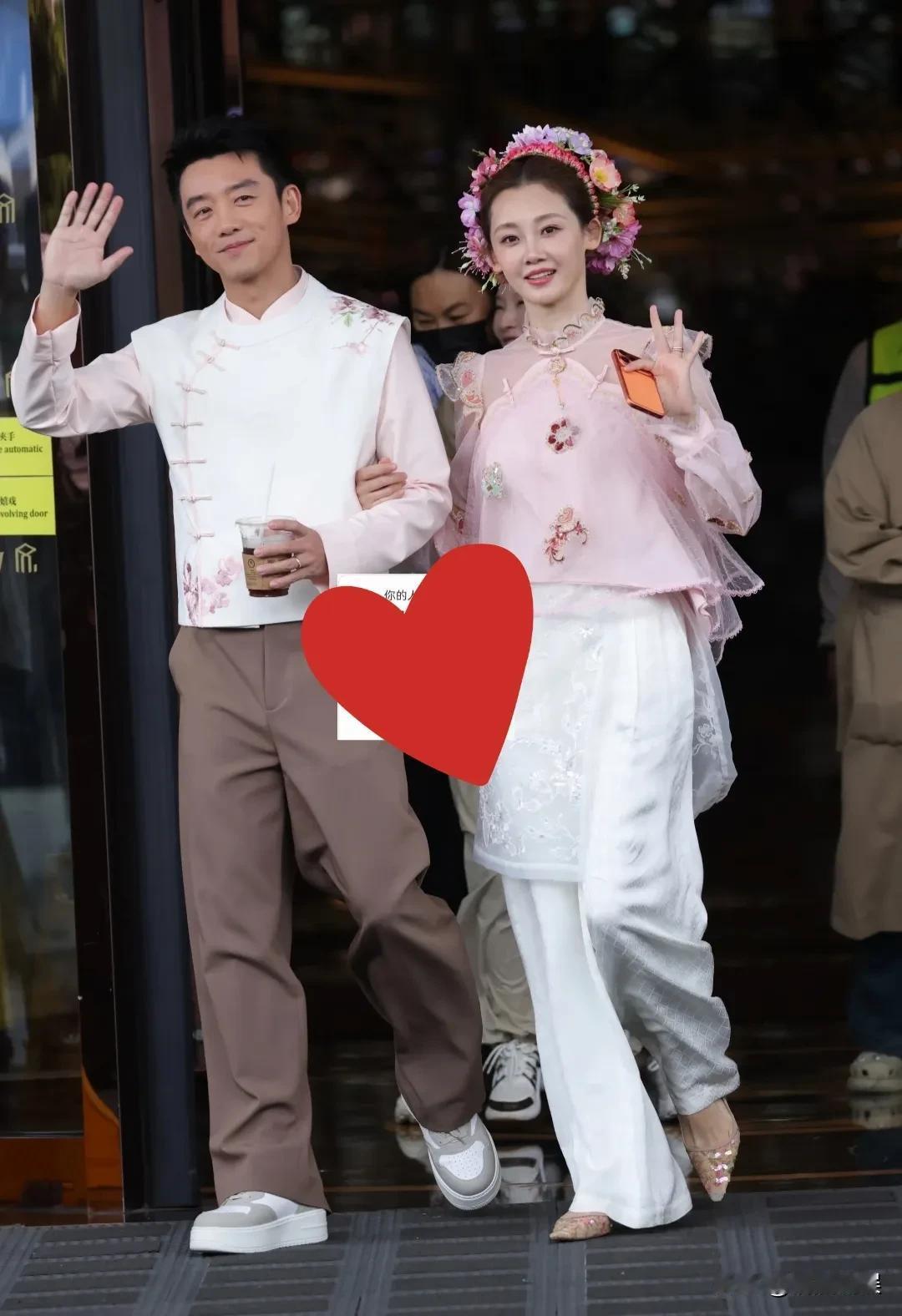 苗苗做了当地传统的簪花造型,额头饱满,脸部圆润,粉色上衣搭配白色裤子,粉粉嫩嫩的,和同样穿着传统服饰的郑恺,看着好般配。