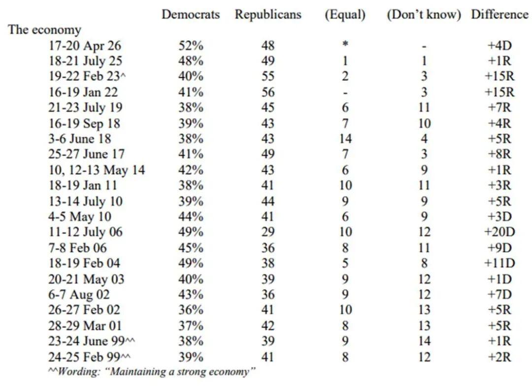 据福克斯新闻进行的最新民调显示,当前美国民众在经济议题上更支持民主党(高出4个百分点),这是自2010年来首次出现这一情况。