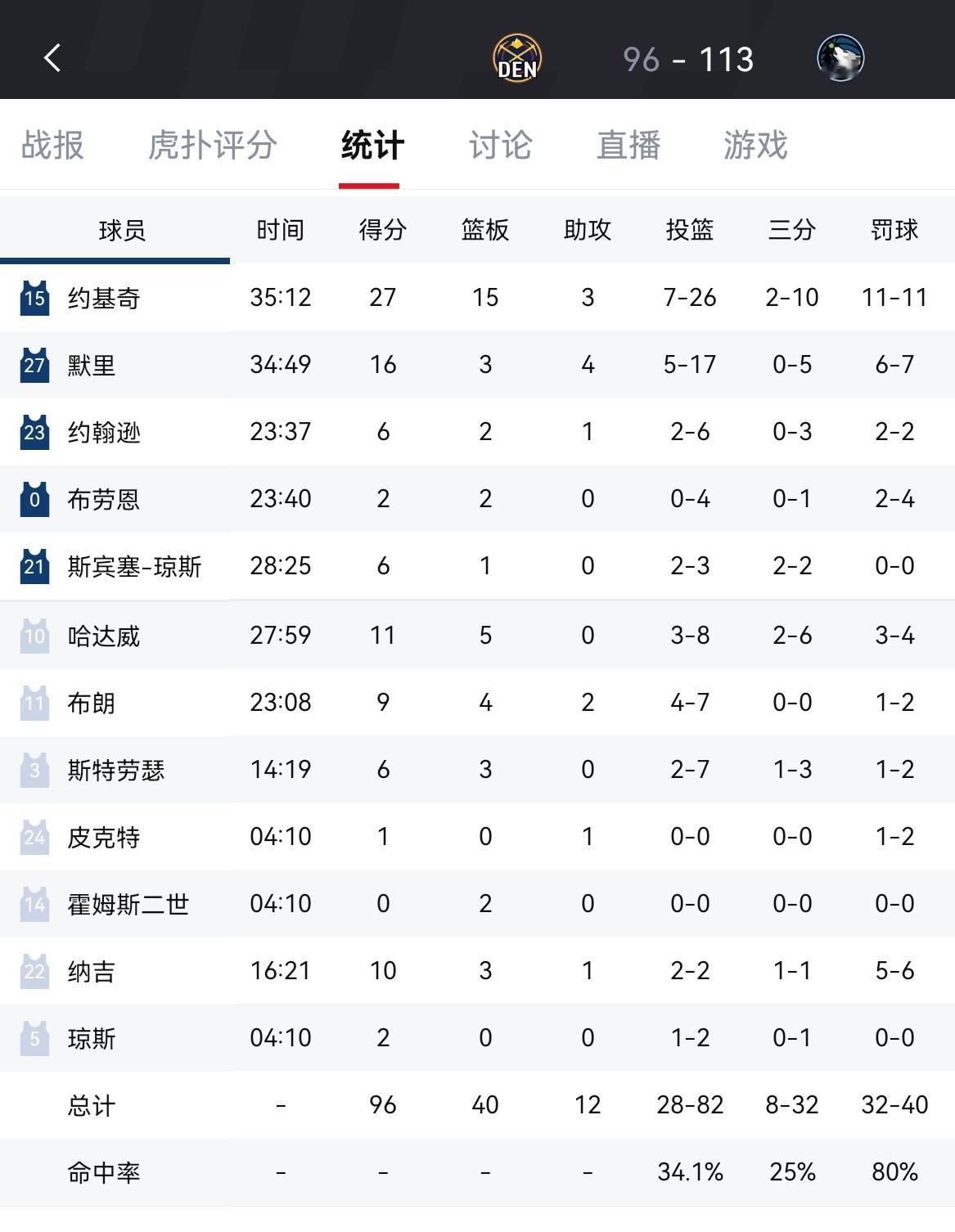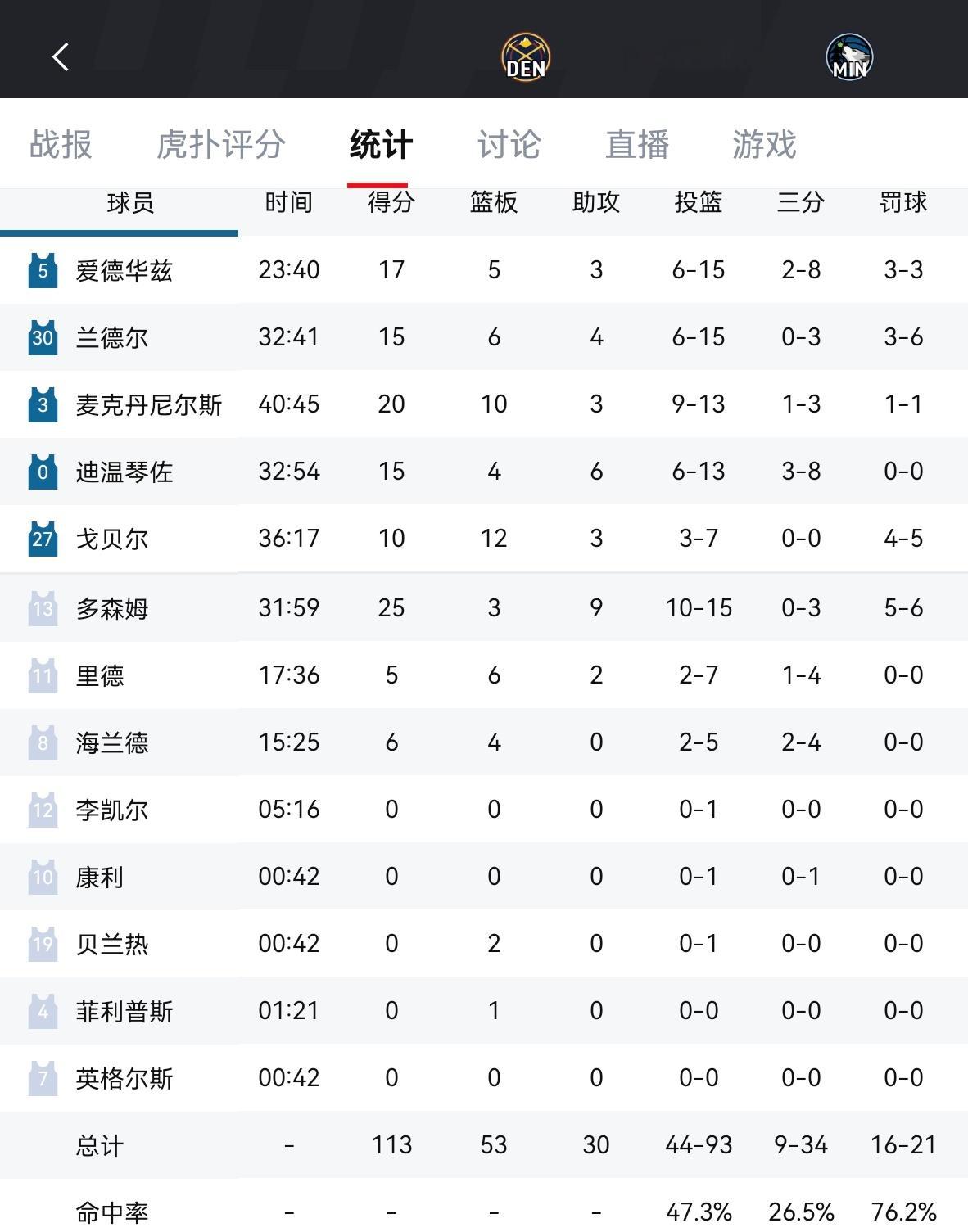 森林狼113-96掘金,大比分2-1领先。约基奇被限制26中7,穆雷被限制17中