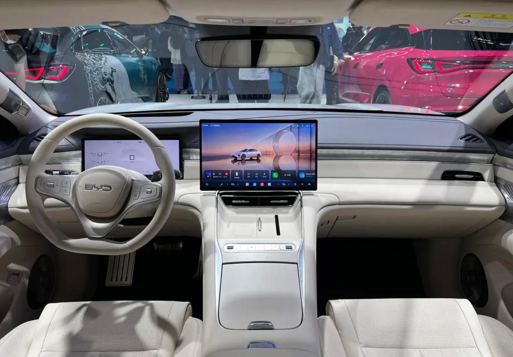 采用海洋美学2.0全新旗舰座舱,通过大量的皮质包裹、装饰件和氛围灯营造豪华氛围,你会注意到方向盘、空调出风口、按键、扬声器、按键等细节之处都有金属镀铬装点。中控台的核心位置仍然是悬浮式的方形中控屏,新车继续采用怀挡设计,并保留部分物理按键。