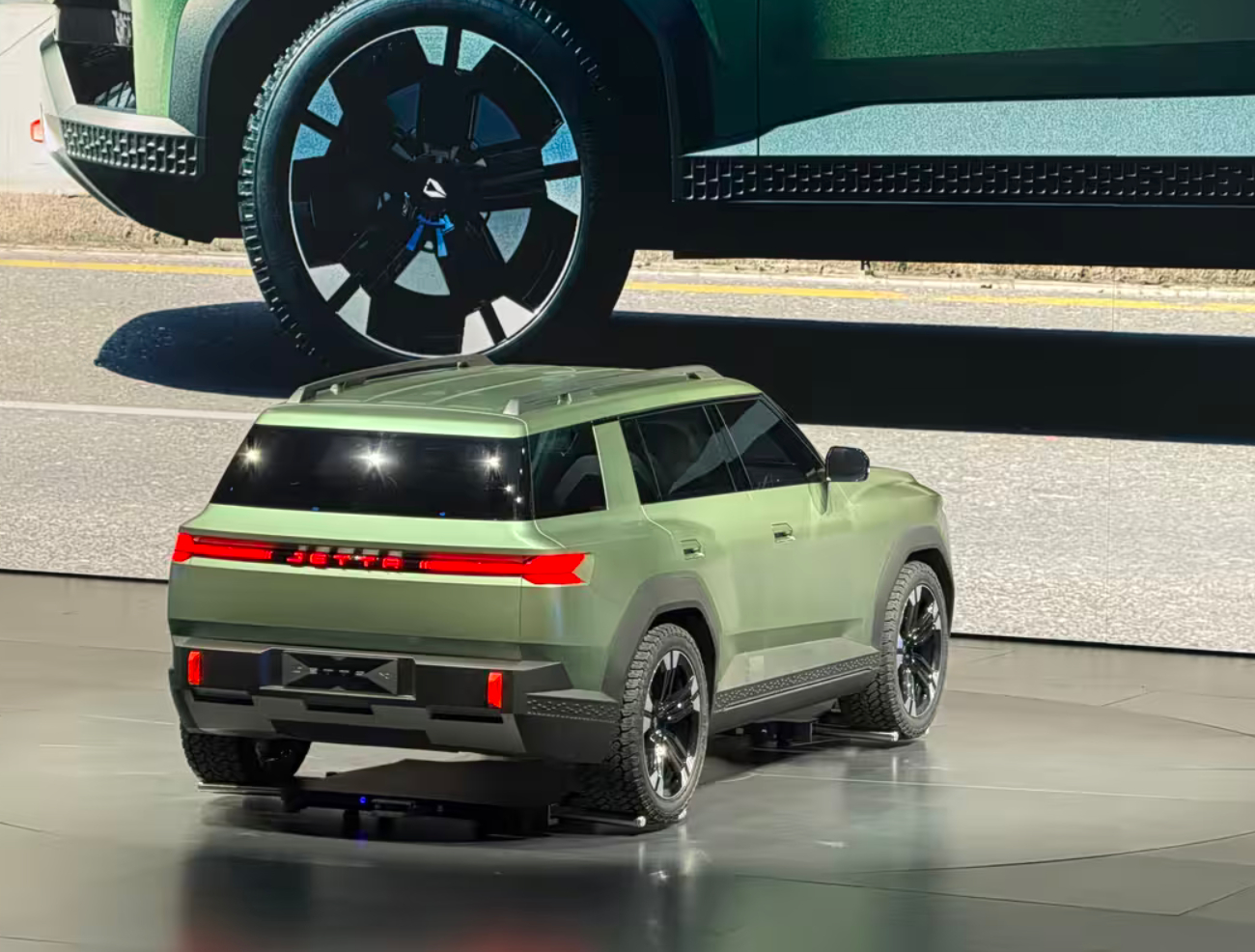 在外观设计方面,此车运用了全新的设计语言,整体展现出方正硬朗的硬派SUV风格,一改燃油车偏向居家的设计路线。其前脸采用了凌厉的分体式灯组设计,同时取消了进气格栅。车身侧面线条平直且饱满,极具肌肉感。