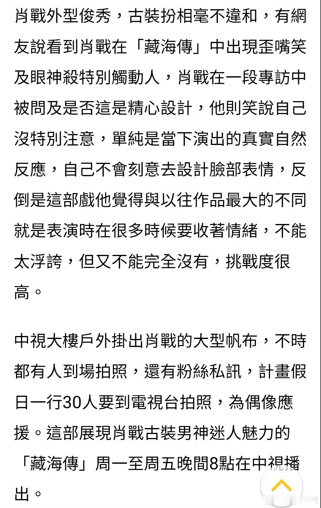 台湾联合报报道:肖战魅力难挡,《藏海传》收视狂飙,收视总人口73.8万人,是当今台湾媒体里比较罕见的高收视节目了