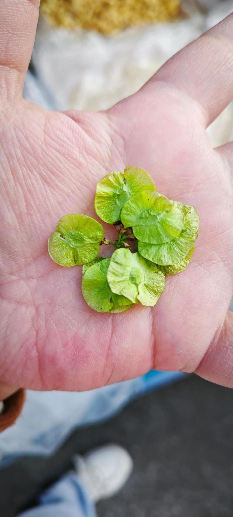 中间小小的硬核,是真正的种子,周围薄薄的绿色圆片,是它的果翅,方便风吹散落,落地生根,来年长出新的小榆树。