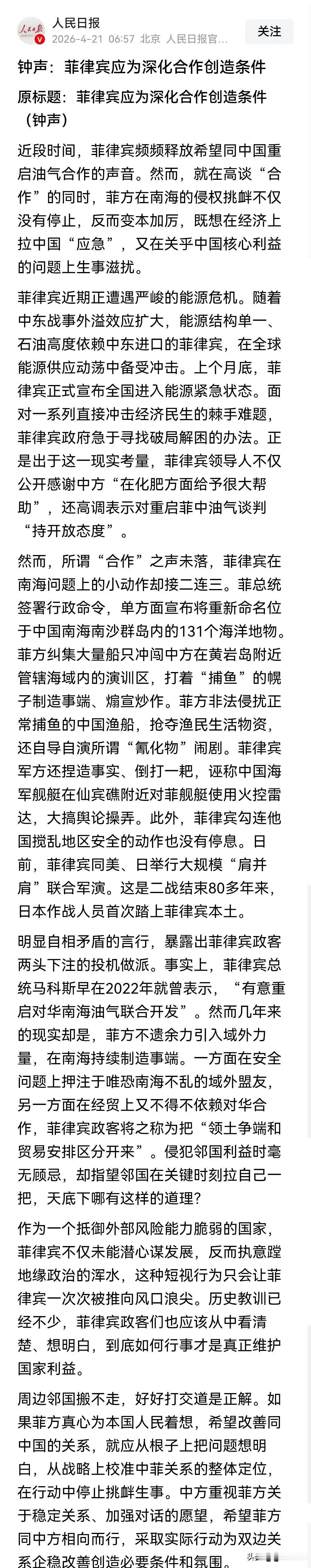 这种行为,用咱们老百姓的话说,就是“吃饭砸锅”。中国之前的克制,是出于睦邻友好的善意,不是无底线的纵容。奉劝马尼拉方面一句:死了那条心吧,投机这条路,走不通!
