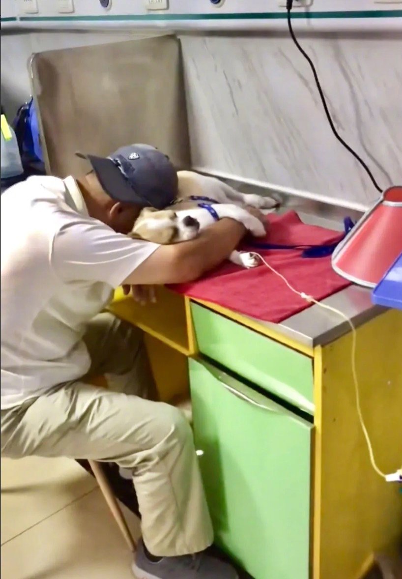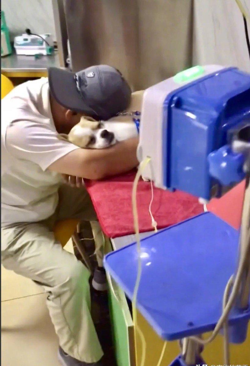大叔带着年老的狗狗看病,大叔趴在狗狗身上睡着了,狗狗也依偎在主人身边睡着了。据网友发视频,7月8日在山东烟台市,一位大叔带着年老的狗狗去宠物医院看病,狗狗打着点滴,由于大叔一直照顾很疲惫,所以就趴在狗狗身上睡着了,狗狗也依偎在主人双臂间似乎也在享受着美梦。这让人动容的一幕被网友拍了下来,主人和狗狗的那种情份真的很难用言语来形容,既真情又短暂,你陪我一时我陪你一世。为什么很多狗狗和主人之间故事是那么的感人深受,因为那样的情感是那么的无私,或许也是很多人的向往。无私的情感是我们一直所追逐的,所以我们对狗狗有着一种很特殊的感情,它们用自己短暂的一生陪伴在我们身边,不求过多回报。