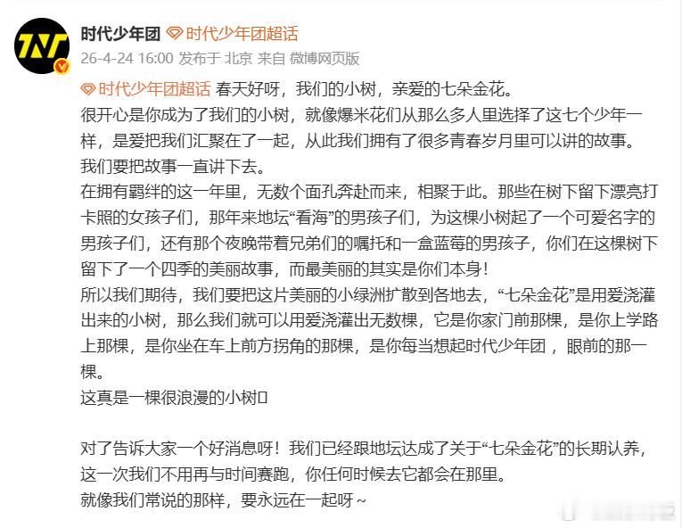 时代少年团长期认养七朵金花时代少年团自己发起的活动自己先参与 发布长文,宣布长期