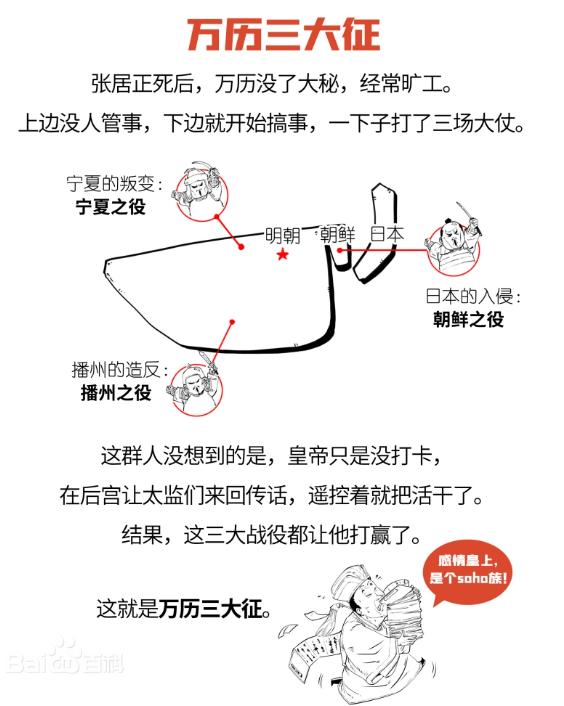 万历三大征拉开明末战争序幕,宁夏之役、播州之役、援朝抗倭之役,历时十余年,耗银近千万两,军费消耗导致国库空虚,朝廷被迫加派赋税,开启明末赋税加派先河,援朝抗倭之役后,辽东明军元气大伤,边防力量削弱,为后金崛起提供条件。