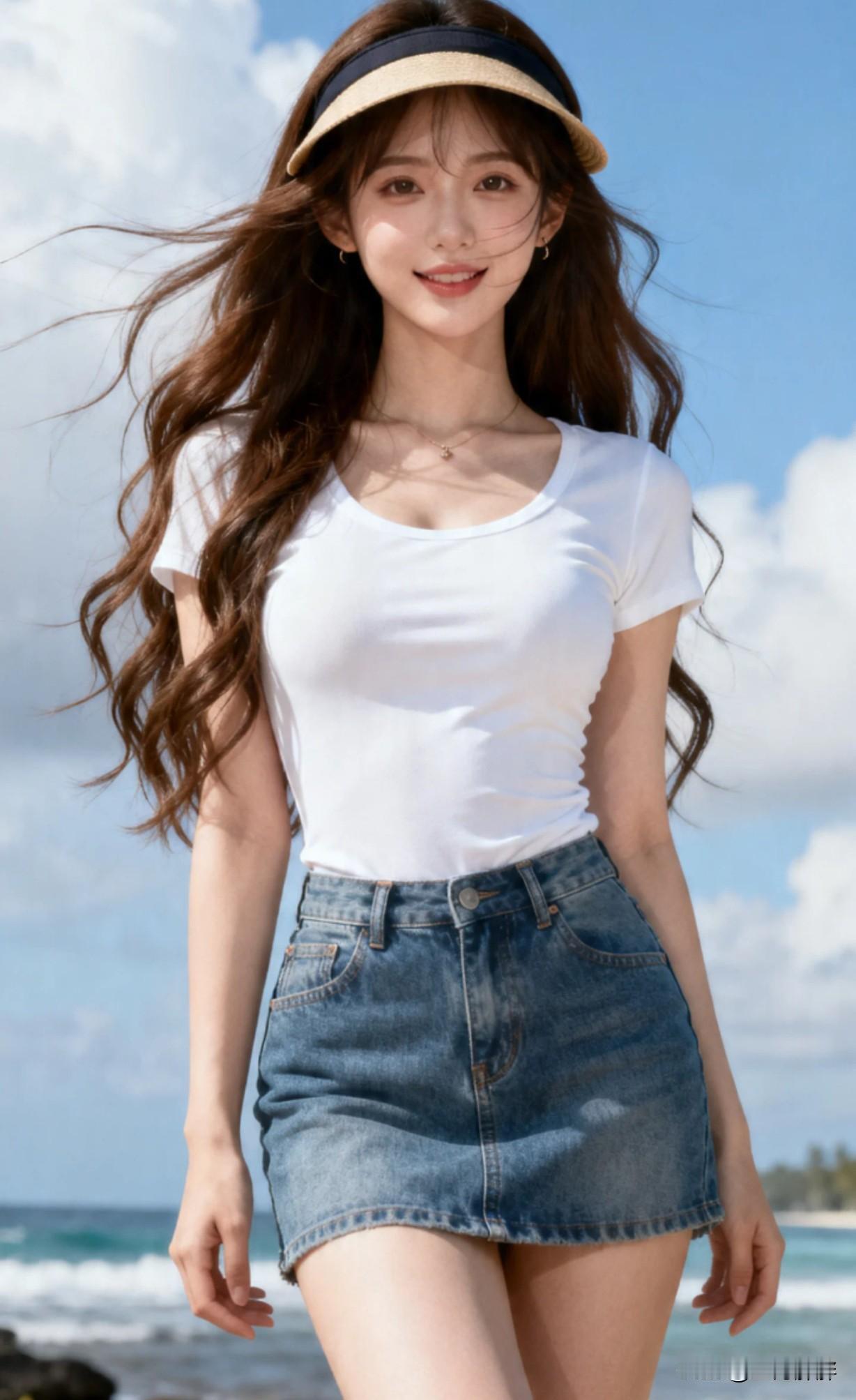 夏日海滩穿搭指南:清爽白T恤+牛仔短裙,轻松自在!🌞👗🏖️她的这一身打扮适