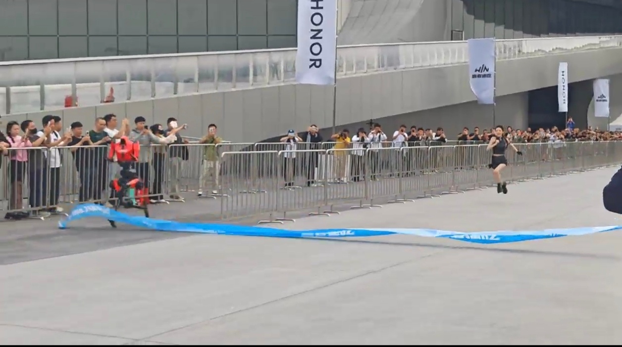 4月23日,荣耀WIN游戏本发布会现场,品牌特邀指挥官张予曦与刚获机器人半马冠军的荣耀“闪电”上演趣味百米赛跑。比赛中,张予曦起跑爆发力强一度领先,“闪电”后程迅速反超,以稳定节奏夺冠。张予曦笑称全程不敢回头,惊叹机器人科技实力。此次人机对决科幻感拉满,也借“闪电”硬核性能,为荣耀WIN游戏本的散热与性能实力背书。张予曦和荣耀闪电百米赛跑