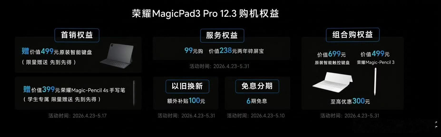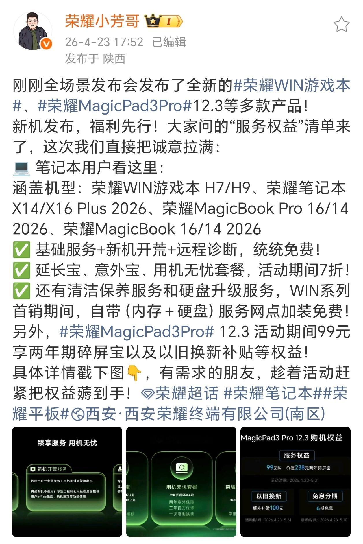 荣耀新机上市 超值购机权益同步上线荣耀全新全场景新品发布会落幕,WIN系列游戏本、MagicBook系列笔记本、MagicPad3 Pro 12.3平板等多款新品登场,超多诚意购机福利同步解锁。平板方面,MagicPad3 Pro首销限时赠原装键盘、手写笔,学生还有专属好礼,99元即可购两年碎屏宝,支持以旧换新补贴与6期免息。笔记本用户可享免费基础保障、新机开荒、远程诊断全套服务,延长保、意外保障套餐限时7折;WIN游戏本首销期内存硬盘加装全免费。多重省心官方增值服务加持,从购机礼包、防护保障到后期维护全面覆盖,入手新机正当时,轻松享受全程无忧的用机体验。