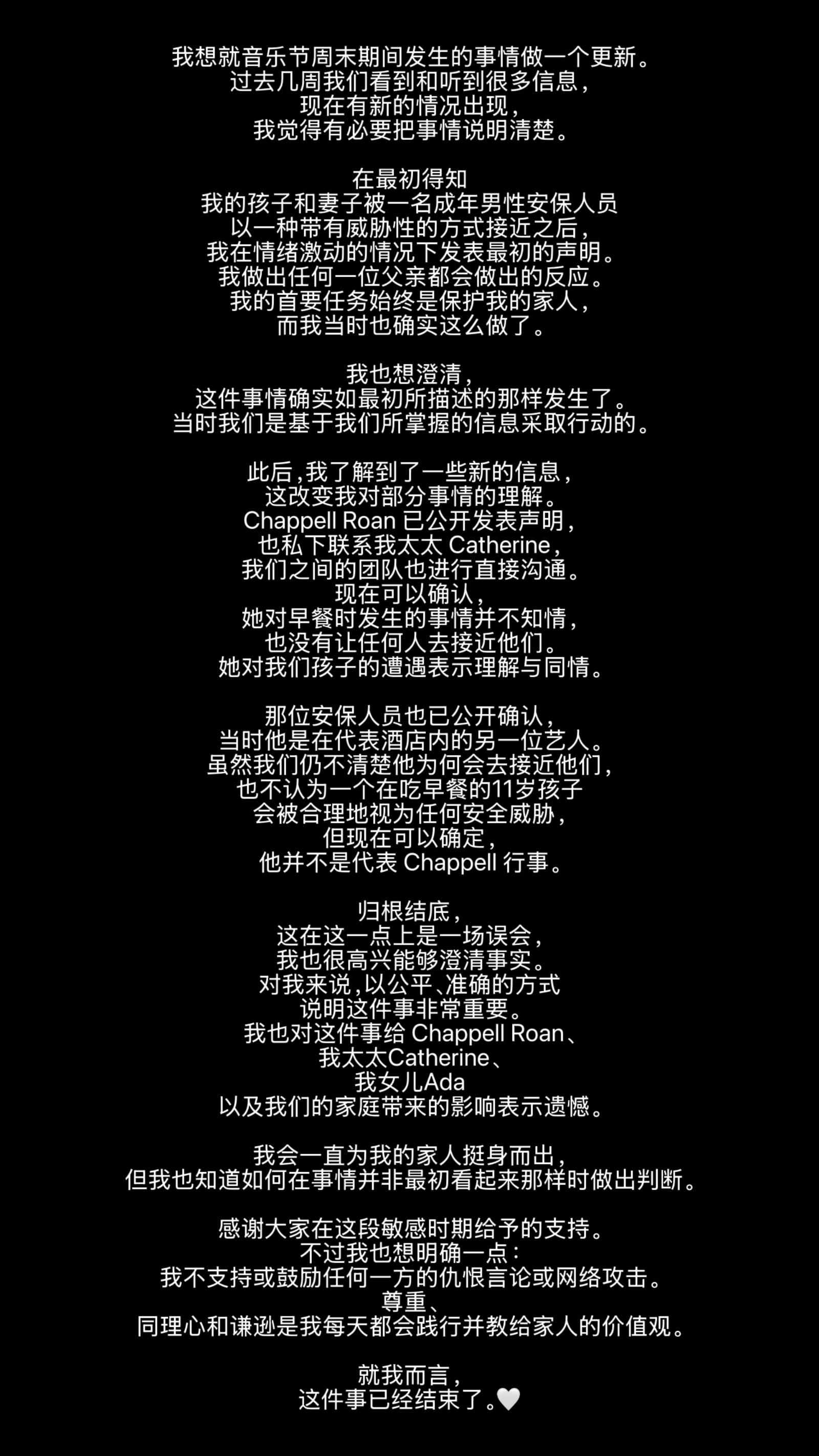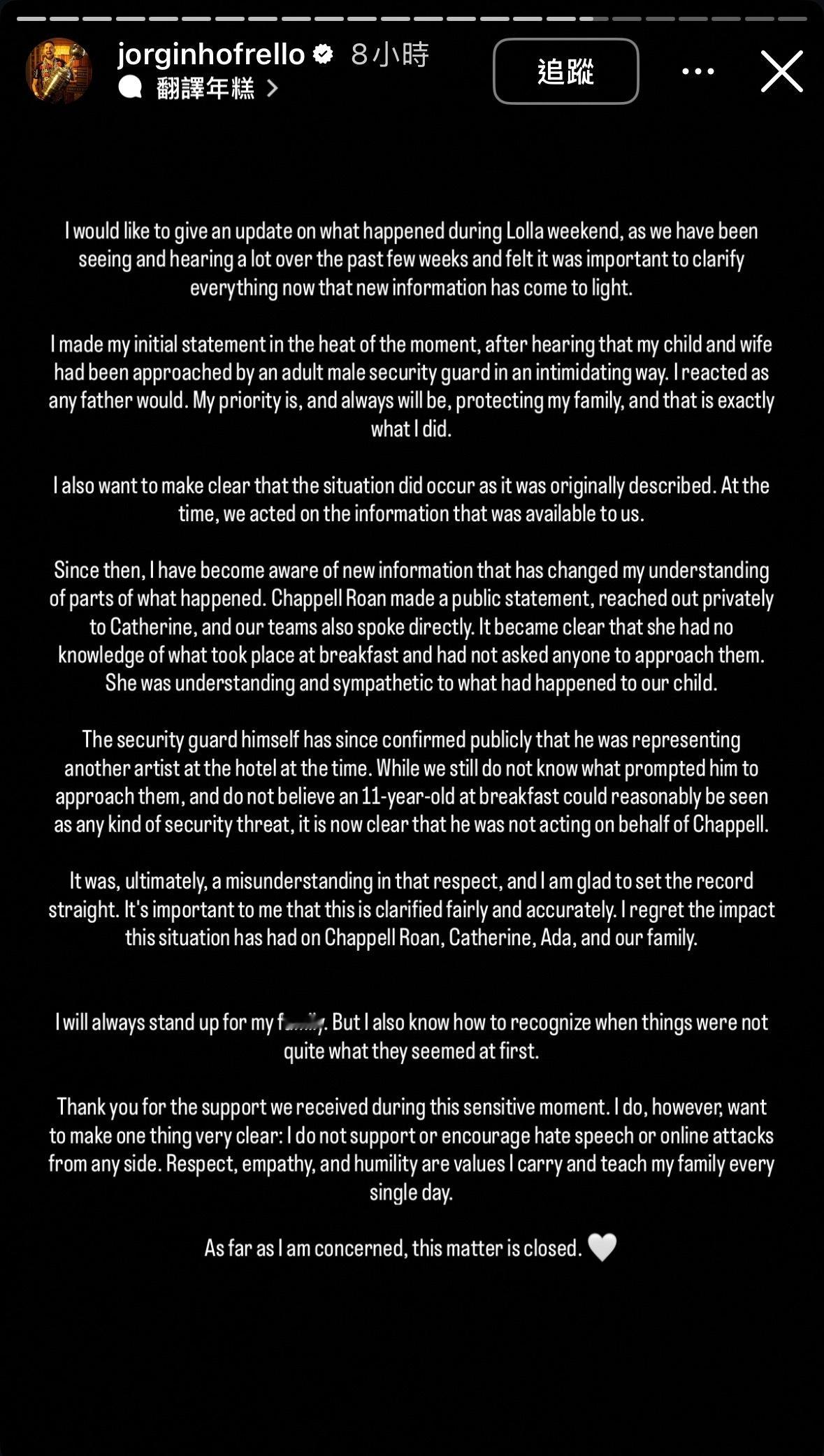 【📢】意大利球星 Jorginho Frello 若日尼奥 发布全新公开声明澄清事实:称此前自己太太和女儿所遭遇的安保事件本质为一场误会,该名保镖与 Chappell Roan 完全无关。