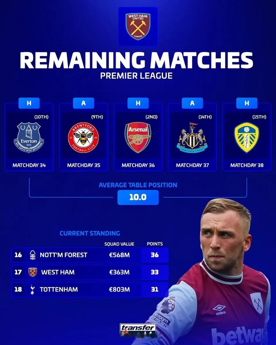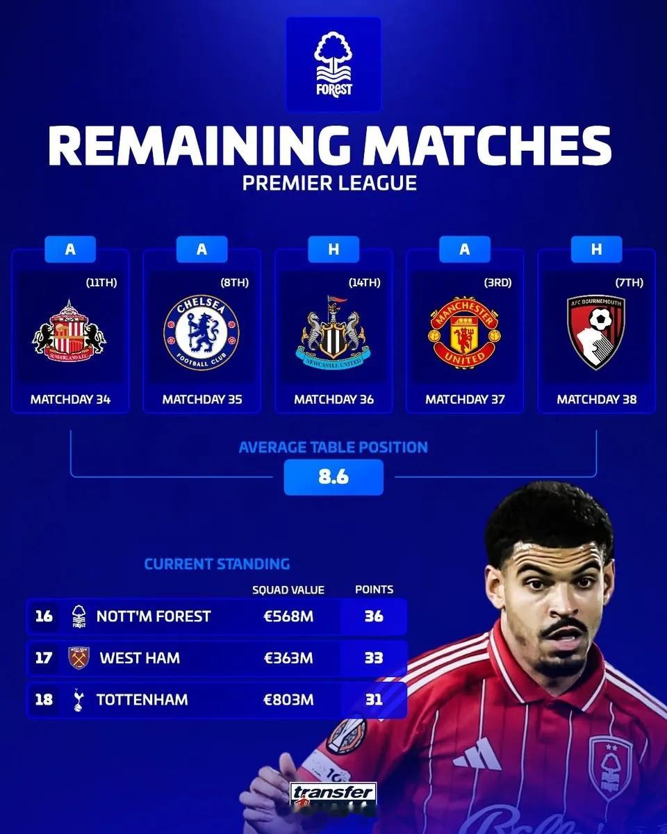 森林/西汉姆/热刺最后五轮对手平均排名:热刺对手排名最低