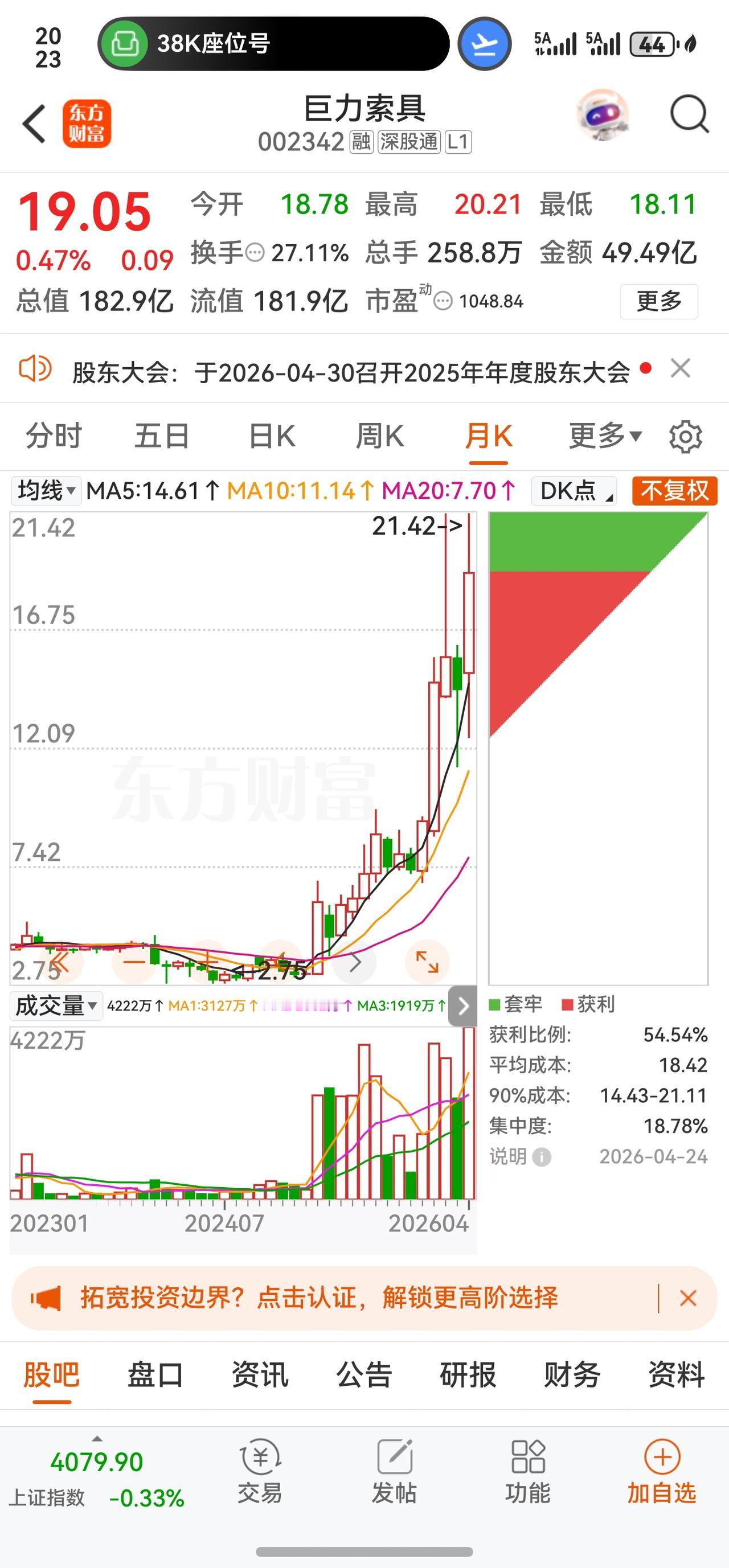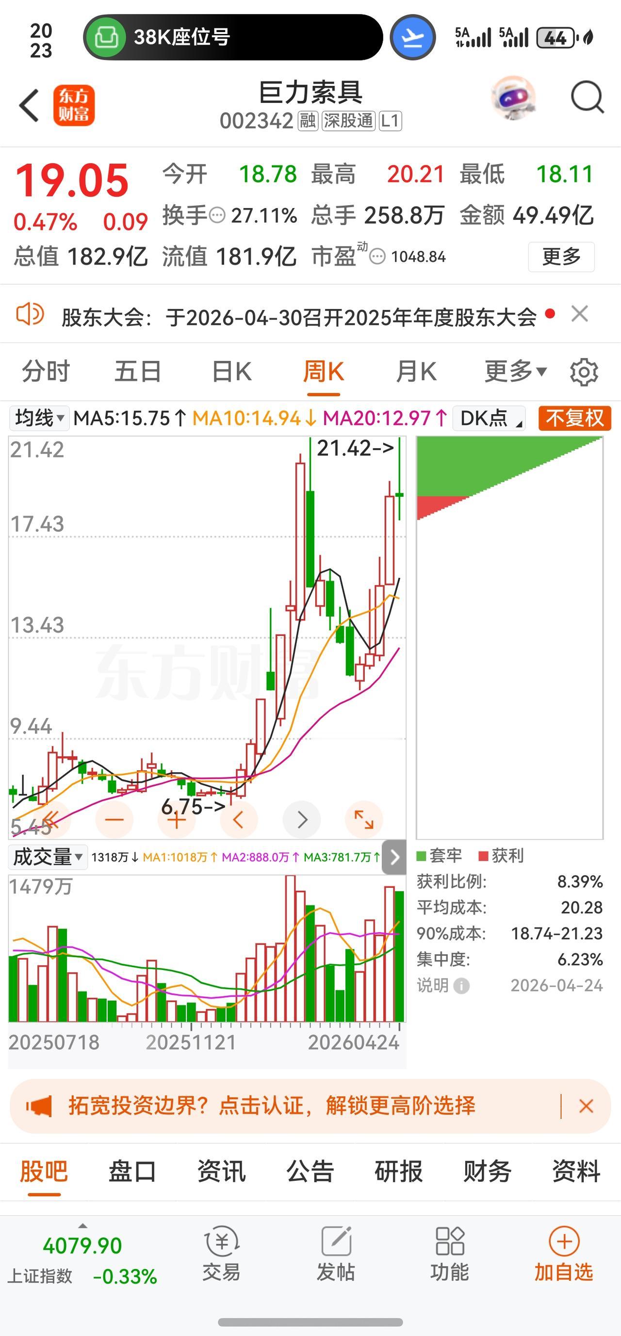 截至2026年4月24日收盘,巨力索具A股报收19.05元,较昨收18.96元微涨0.09元(+0.47%)。当日价格波动区间为18.11元至20.21元,振幅达11.08%,呈现典型的"过山车"走势——早盘冲高后回落,尾盘在买盘承接下小幅收红。