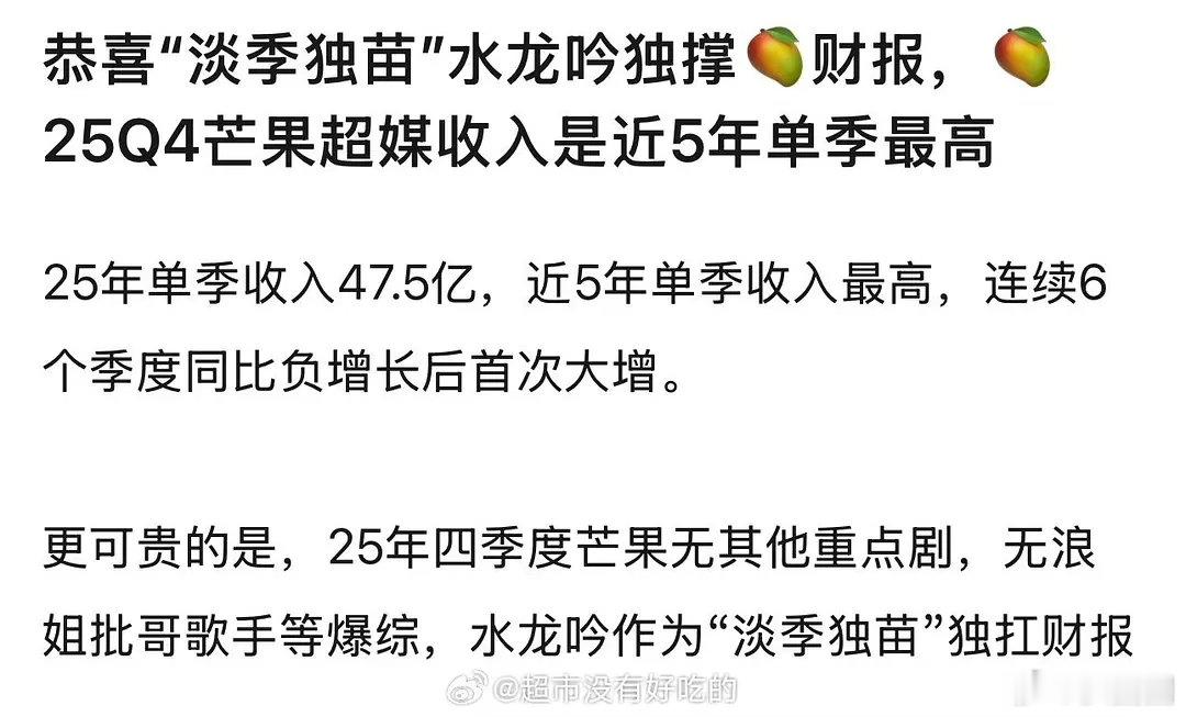 罗云熙水龙吟4月28非洲播 而且芒果财报已出,水龙吟所在四季度,芒果无热综艺的情况下,近五年营业收入季度第一欸,年冠无争议了吧!