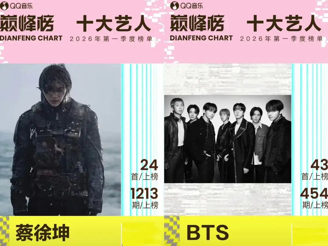 QQ音乐巅峰榜十大艺人新鲜出炉!BTS、蔡徐坤、黄子弘凡、刘宇宁、檀健次、王俊凯