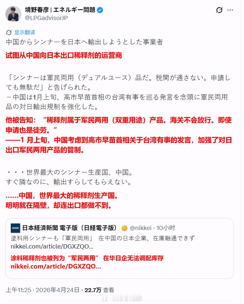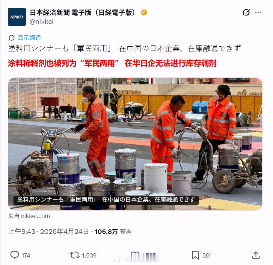 由于中国的军民两用品管制,日本连涂料稀释剂都买不到了,连日企派人亲自跑一趟来中国