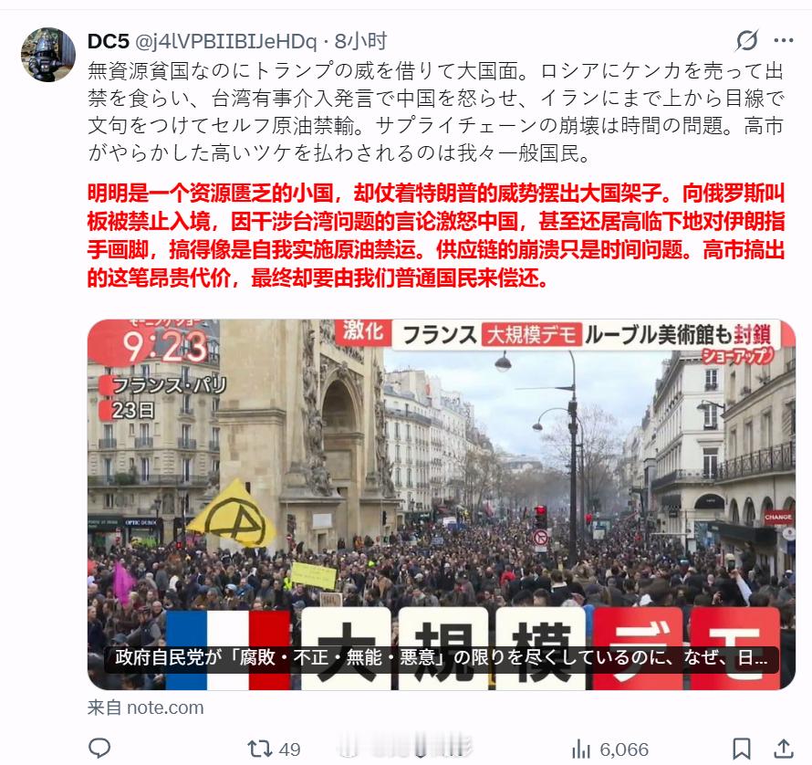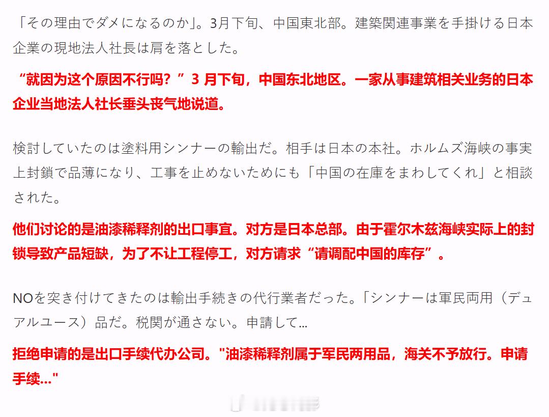 由于中国的军民两用品管制,日本连涂料稀释剂都买不到了,连日企派人亲自跑一趟来中国也买不到了。其实中国这次对日本的管制,在伊朗那边石油运输受影响的背景下,真实造成的后果比预期还大,但是普通日本人一时半会儿还感受不到,于是我们可以看到网上的右翼们还在嚷嚷脱钩,声音挺大的……挺好,其实声音还可以再大点,哥们儿爱听~